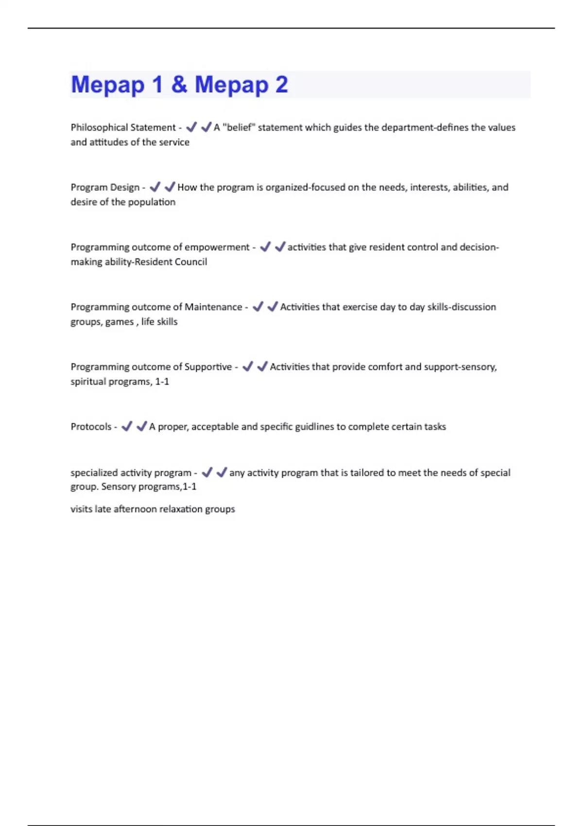 Philosophical Statement - A "belief" statement which guides the department-defines the values and attitudes of the service Program Design - How the program is organized-focused on the needs, interests, abilities, and desire of the population Programming outcome of empowerment - activities that give resident control and decisionmaking ability-Resident Council Programming outcome of Maintenance - Activities that exercise day to day skills-discussion groups, games , life skills Programming outcome of Supportive - Activities that provide comfort and support-sensory, spiritual programs, 1-1 Protocols - A proper, acceptable and specific guidlines to complete certain tasks specialized activity program - any activity program that is tailored to meet the needs of special group. Sensory programs,1-1 visits late afternoon relaxation groups