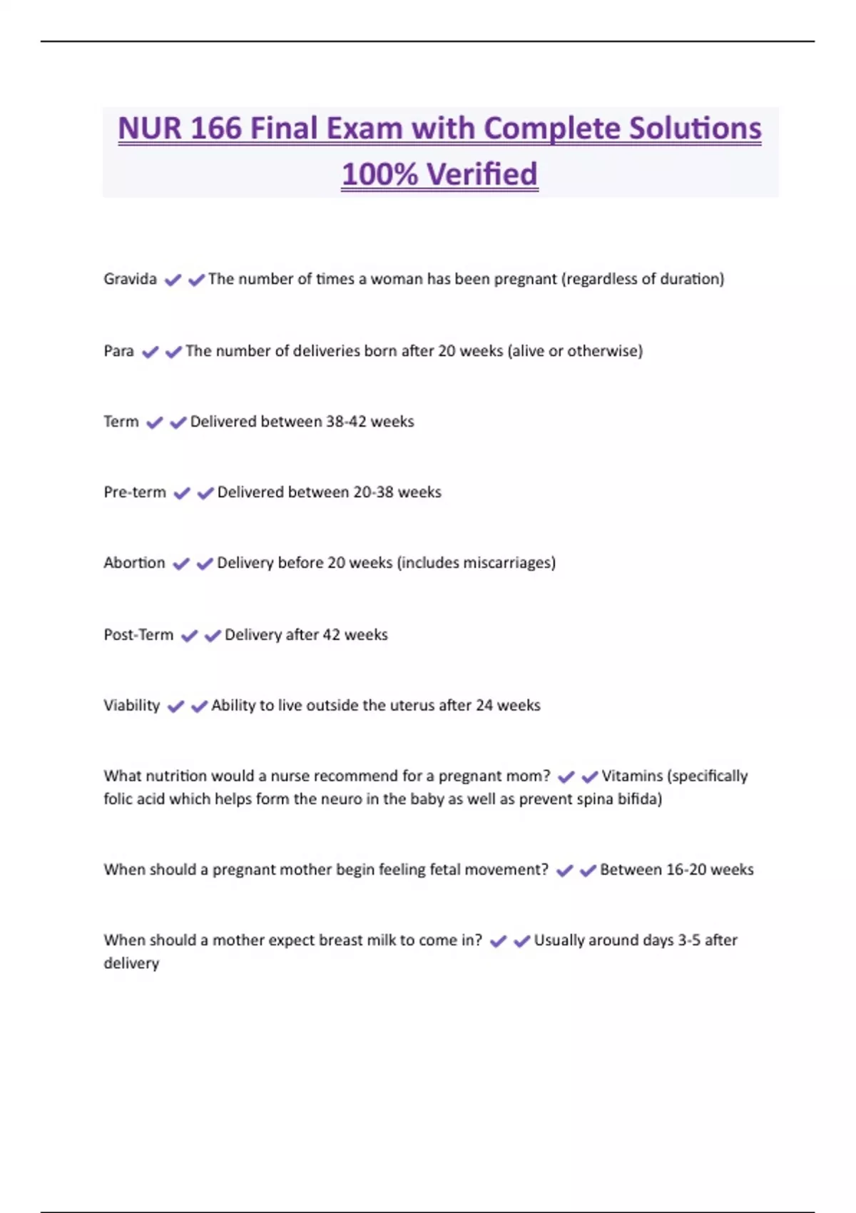NUR 166 Final Exam with Complete Solutions 100% Verified Gravida The number of times a woman has been pregnant (regardless of duration) Para The number of deliveries born after 20 weeks (alive or otherwise) Term Delivered between 38-42 weeks Pre-term Delivered between 20-38 weeks Abortion Delivery before 20 weeks (includes miscarriages) Post-Term Delivery after 42 weeks Viability Ability to live outside the uterus after 24 weeks What nutrition would a nurse recommend for a pregnant mom? Vitamins (specifically folic acid which helps form the neuro in the baby as well as prevent spina bifida