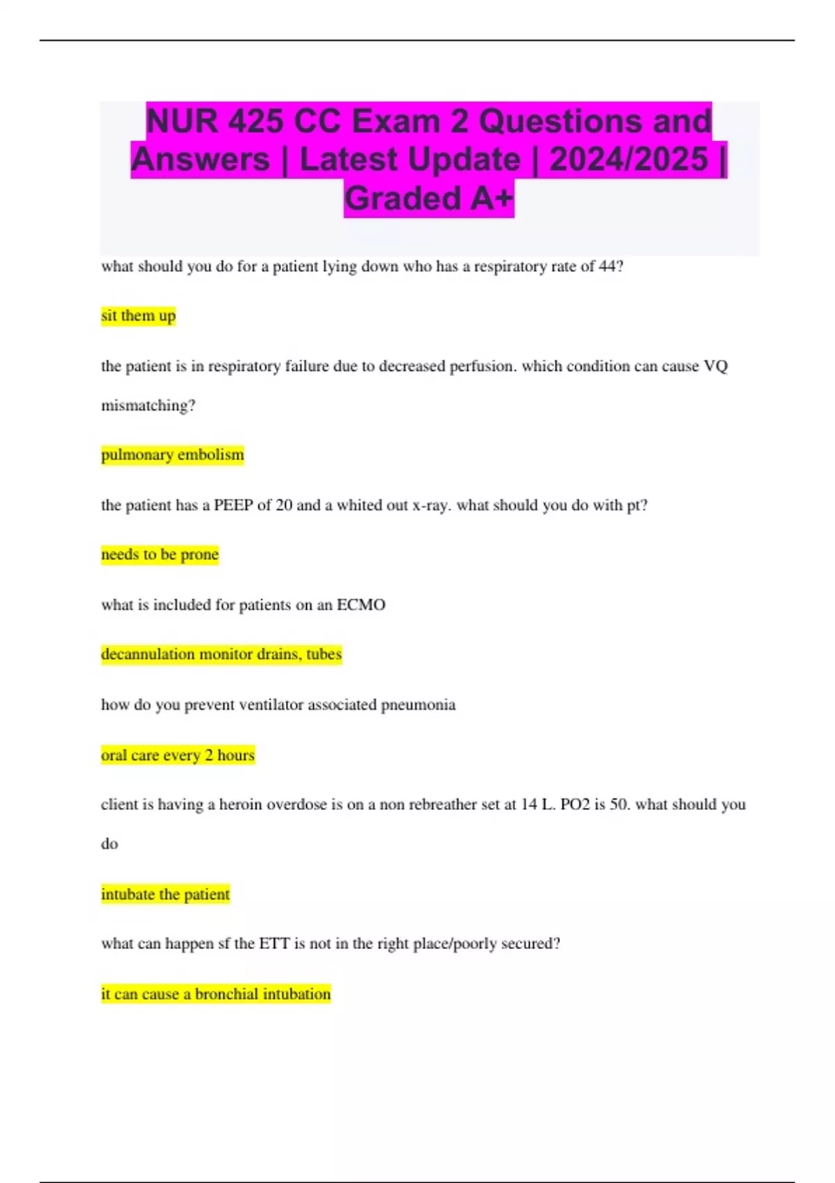 NUR 425 CC Exam 2 Questions and Answers | Latest Update | 2024/2025 | Graded A+ what should you do for a patient lying down who has a respiratory rate of 44? sit them up the patient is in respiratory failure due to decreased perfusion. which condition can cause VQ mismatching? pulmonary embolism the patient has a PEEP of 20 and a whited out x-ray. what should you do with pt? needs to be prone what is included for patients on an ECMO decannulation monitor drains, tubes how do you prevent ventilator associated pneumonia oral care every 2 hours client is having a heroin overdose is on a non rebreather set at 14 L. PO2 is 50. what should you do intubate the patient what can happen sf the ETT is not in the right place/poorly secured? it can cause a bronchial intubation what does it meant if the patient is switched form pressure support to assist control? they cannot breathe on their own, getting worse reasons for low ventilator alarms air leak, tube disconnect, ET tube displaced, vent malfunction reasons for high ventilator alarms biting tube, mucus plug, coughing, gagging, kinked How does your body correct an acid imbalance? the renal system Which situation can cause alkalosis? client has anxiety and low CO2 Which statement correctly explains acid base regulation? lungs can compensate for a max of 24 hours what do you do for a patient with low bicarb give bicarb ABG for someone with diarrhea acidosis = GI loss pH = 7.3 bicarb will be low what are the most accurate assessment parameters to determine adequate tissue perfusion in a patient with shock? pulse, BP, respirations SIMV spontaneous, ventilator has a set rate (min) but patient can breath over it AC assist control, ventilator is doing all the work, TOTAL support CPAP -close to extubation, machine is just keeping airway open how long can the lungs compensate 24 hour max pH = 7.49, CO2 = 55, bicarb = 35 partial metabolic alkalosis pH = 7.57 (high), CO2 = 65, PO2 = 81 CPAP what should you do for clients with acute respiratory disorder increase the PEEP on ventilator what do corticosteroids do