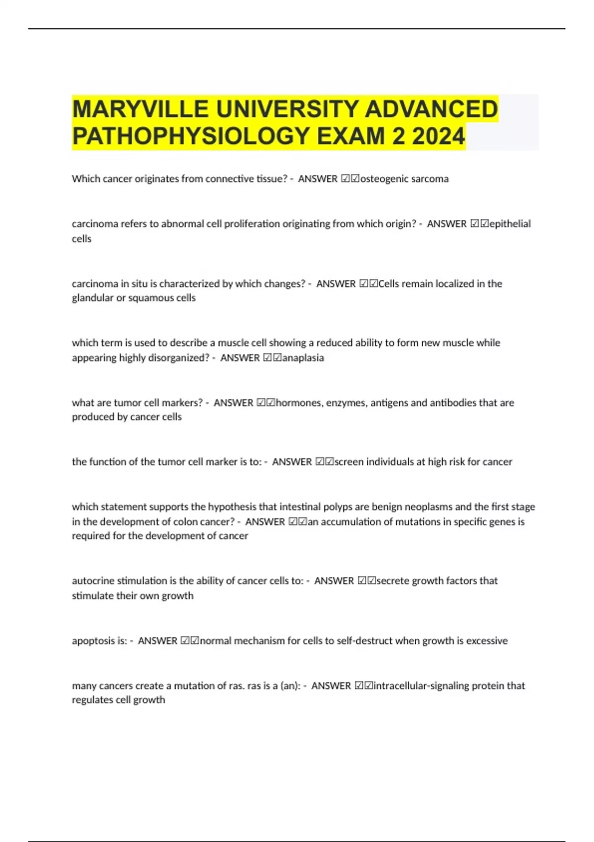 Which cancer originates from connective tissue? - ANSWER ☑☑osteogenic sarcoma carcinoma refers to abnormal cell proliferation originating from which origin? - ANSWER ☑☑epithelial cells carcinoma in situ is characterized by which changes? - ANSWER ☑☑Cells remain localized in the glandular or squamous cells which term is used to describe a muscle cell showing a reduced ability to form new muscle while appearing highly disorganized? - ANSWER ☑☑anaplasia what are tumor cell markers? - ANSWER ☑☑hormones, enzymes, antigens and antibodies that are produced by cancer cells the function of the tumor cell marker is to: - ANSWER ☑☑screen individuals at high risk for cancer which statement supports the hypothesis that intestinal polyps are benign neoplasms and the first stage in the development of colon cancer? - ANSWER ☑☑an accumulation of mutations in specific genes is required for the development of cancer autocrine stimulation is the ability of cancer cells to: - ANSWER ☑☑secrete growth factors that stimulate their own growth