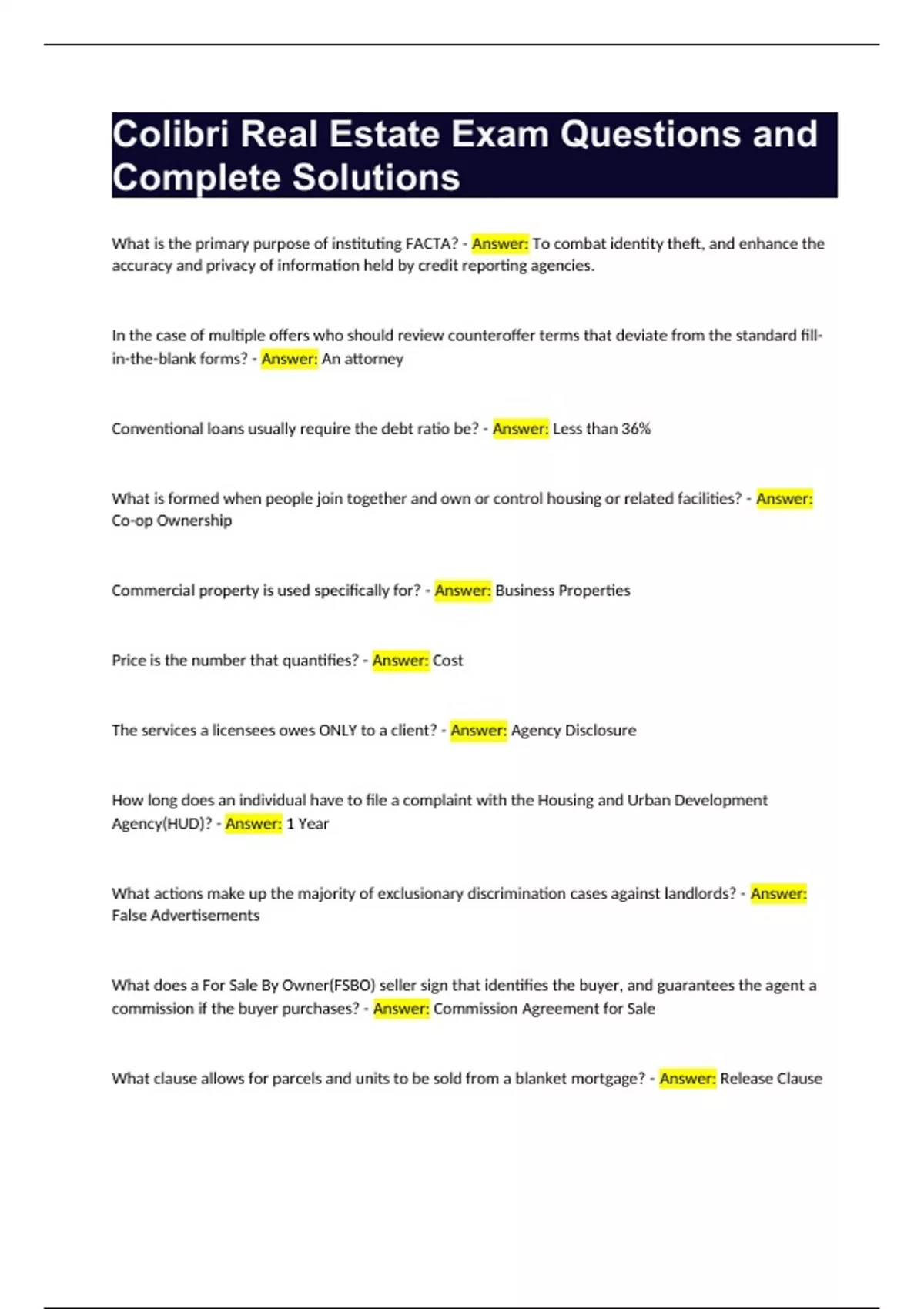 Colibri Real Estate Exam Questions and Complete Solutions What is the primary purpose of instituting FACTA? - Answer: To combat identity theft, and enhance the accuracy and privacy of information held by credit reporting agencies. In the case of multiple offers who should review counteroffer terms that deviate from the standard fill-in-the-blank forms? - Answer: An attorney Conventional loans usually require the debt ratio be? - Answer: Less than 36% What is formed when people join together and own or control housing or related facilities? - Answer: Co-op Ownership Commercial property is used specifically for? - Answer: Business Properties Price is the number that quantifies? - Answer: Cost The services a licensees owes ONLY to a client? - Answer: Agency Disclosure How long does an individual have to file a complaint with the Housing and Urban Development Agency(HUD)? - Answer: 1 Year What actions make up the majority of exclusionary discrimination cases against landlords? - Answer: False Advertisements What does a For Sale By Owner(FSBO) seller sign that identifies the buyer, and guarantees the agent a commission if the buyer purchases? - Answer: Commission Agreement for Sale What clause allows for parcels and units to be sold from a blanket mortgage? - Answer: Release Clause To avoid litigation, what should all Real Estate(RE) companies using websites develop? - Answer: An Internet Advertising Policy What is it called when the lack of public sites in urban minority areas have contributed to the urban decay? - Answer: Public Domain Racism What gives the public constructive notice of a grantee's ownership? - Answer: Recording the Deed Life insurance companies typically invest how much of their assets in RE? - Answer: (3/4), three- fourths Why should agents avoid expressing value judgements when advertising? - Answer: So as to not mislead the consumer With a reverse annuity mortgage, the lender is making payments to? - Answer: Borrower An insured conventional loan is similar to a Federal Housing Administration(FHA) loan, except the insurer is? - Answer: Secondary Lender What protected class was added by Fair Housing Amendments Act in 1988? - Answer: Families with children, and people with disabilities According to government regulations, the majority of a savings and loan association's assets must be in? - Answer: Real Estate Loans What type of deed offers the greatest protection and is the most used? - Answer: General Warranty Deed In universal agency who is held accountable for the actions of the agent? - Answer: The Principal Who is responsible for enforcing Code of Ethics, providing mediation and holding arbitration hearings? - Answer: National Association of Realtors(NAR) What article in Broker/Salesperson Independent Contractor Agreement says salesperson cannot charge a commission less than the brokers established %? - Answer: Commissions Where would the seller give information about private or public architecture review control of the property in the Seller's Property Disclosure? - Answer: Structural Items Effective Gross Income (-) Total Operating Expenses= - Answer: Net Operating Income If an agent is not sure what another party is saying, what should they do? - Answer: Ask Questions Objective infeasibility means what? - Answer: No one can render performance What type of loan is linked to an economic index? - Answer: Adjustable Rate Mortgage(ARM) Described as a measure of the strength of a currency or monetary system? - Answer: Purchasing Power What are the largest sources of household wealth? - Answer: Home Equity/ Retirement Accounts An arrangement in which a manufacturer sells a product to a reseller only on condition that the reseller also buys another less popular product. - Answer: Tie-in-Arrangements An agreement among competitors to raise, lower, maintain, or stabilize prices or price levels. - Answer: Price-Fixing Allows law enforcement officials to obtain a search warrant anywhere a terrorist-related activity has occurred. Search of the specially designated nationals list maintained by the United States Office of Foreign Assets Control. - Answer: Patriot Act Search What type of marketing dominates the advertising platform? - Answer: Internet Advertising The exchange or substitution of a new debt for an existing debt by mutual agreement? - Answer: Novation What was created to insure buyer & seller have knowledge of all settlement costs? - Answer: 1974 RESPA In a buyer agency agreement what funds need to be explained? - Answer: Broker fee & explanation of Real Estate Recovery Fund What person performs a VA appraisal? - Answer: VA fee appraisers A real estate firm may offer a computerized loan organization system (CLO), who does RESPA say must pay the fee for such a service? - Answer: The borrower A closing disclosure must contain the information prescribed in the: - Answer: TRID rule What type of insurance would a borrower purchase to protect the lender from potential losses? - Answer: Private Mortgage Insurance If an agent is in competition with 2 other listing agents for the listing, what will give the agent an edge? - Answer: Commission Rates What type of RE user would be interested in convenience and access to services & other facilities? - Answer: A residential user A broker price option must include what the price was based on and: - Answer: Applicable market data According to the CAN-SPAM Act, commercial e-mailers must reveal the identity of the sender and: - Answer: The name of the advertiser entity An underwriting red flag occurs when there is a gift letter without? - Answer: Any bank statements to back it up Exclusionary discrimination is typically? - Answer: Subtle A market study is made to find those comparable sales and listings that are what? - Answer: Similar to the property being appraised Credit unions and commercial banks are what type of lenders? - Answer: Primary mortgage market lenders What provision in the Independent Contractor Agreement says the as