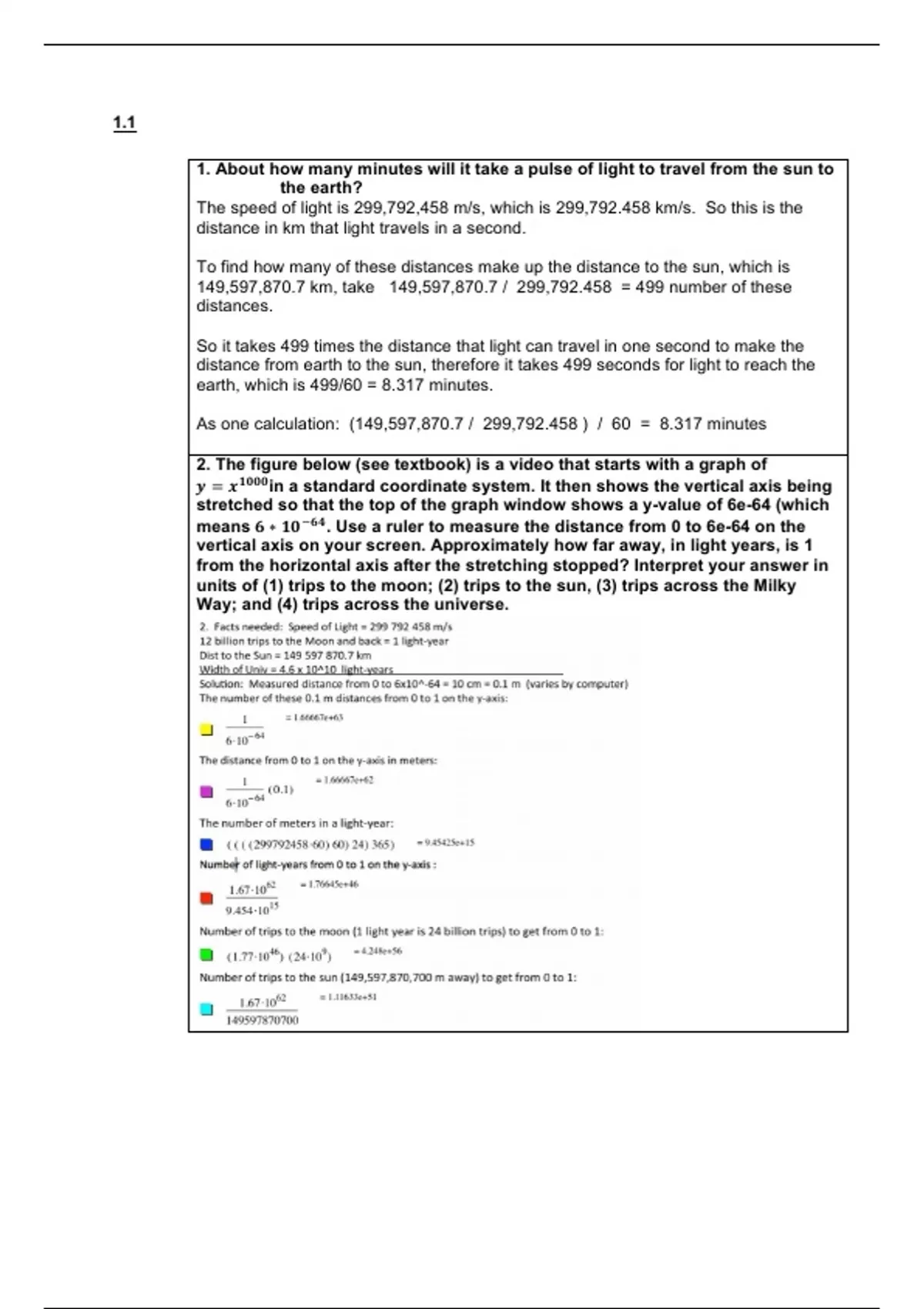 1. About how many minutes will it take a pulse of light to travel from the sun to the earth? The speed of light is 299,792,458 m/s, which is 299,792.458 km/s. So this is the distance in km that light travels in a second. To find how many of these distances make up the distance to the sun, which is 149,597,870.7 km, take 149,597,870.7 / 299,792.458 = 499 number of these distances. So it takes 499 times the distance that light can travel in one second to make the distance from earth to the sun, therefore it takes 499 seconds for light to reach the earth, which is 499/60 = 8.317 minutes. As one calculation: (149,597,870.7 / 299,792.458 ) / 60 = 8.317 minutes 2. The figure below (see textbook) is a video that starts with a graph of