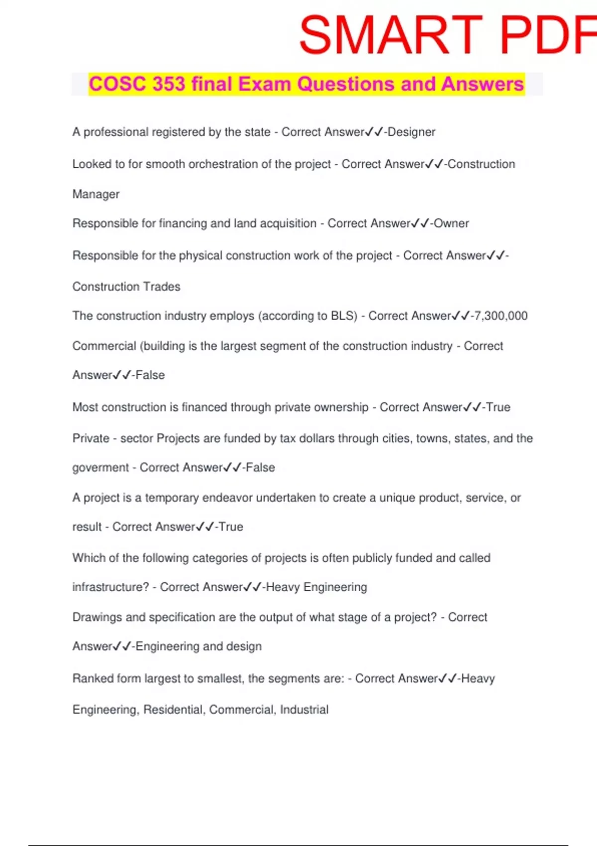 COSC 353 final Exam Questions and Answers A professional registered by the state - Correct Answer️️ -Designer Looked to for smooth orchestration of the project - Correct Answer️️ -Construction Manager Responsible for financing and land acquisition - Correct Answer️️ -Owner Responsible for the physical construction work of the project - Correct Answer️️ - Construction Trades The construction industry employs (according to BLS) - Correct Answer️️ -7,300,000 Commercial (building is the largest segment of the construction industry - Correct Answer️️ -False Most construction is financed through private ownership - Correct Answer️️ -True Private - sector Projects are funded by tax dollars through cities, towns, states, and the goverment - Correct Answer️️ -False A project is a temporary endeavor undertaken to create a unique product, service, or result - Correct Answer️️ -True Which of the following categories of projects is often publicly funded and called infrastructure? - Correct Answer️️ -Heavy Engineering Drawings and specification are the output of what stage of a project? - Correct Answer️️ -Engineering and design Ranked form largest to smallest, the segments are: - Correct Answer️️ -Heavy Engineering, Residential, Commercial, IndustrialSMART PDF Which category of construction is characterized by many small companies great instability during economic recessions? - Correct Answer️️ -Residential In the case of design/build, the constructor acts as a general contractor with single-firm control of all subcontractors. - Correct Answer️️ -True One advantage of Design/Bid/Build method is know project costs before construciton begins - Correct Answer️️ -True Private projects may use invitation for bids to specific contractors that have done past work - Correct Answer️️ -True A seven point code of "expected ethical behavior" is published by - Correct Answer️️ - AIC The 3 steps a project manager does to schedule an operation are as follows: Identify activity, change mission, and develop logic - Correct Answer️️ -False When estimates and schedules are initially prepared, unlimited resource