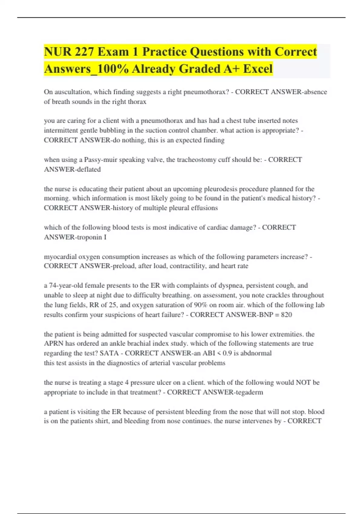 NUR 227 Exam 1 Practice Questions with Correct Answers_100% Already Graded A+ Excel On auscultation, which finding suggests a right pneumothorax? - CORRECT ANSWER-absence of breath sounds in the right thorax you are caring for a client with a pneumothorax and has had a chest tube inserted notes intermittent gentle bubbling in the suction control chamber. what action is appropriate? - CORRECT ANSWER-do nothing, this is an expected finding when using a Passy-muir speaking valve, the tracheostomy cuff should be: - CORRECT ANSWER-deflated the nurse is educating their patient about an upcoming pleurodesis procedure planned for the morning. which information is most likely going to be found in the patient's medical history? - CORRECT ANSWER-history of multiple pleural effusions which of the following blood tests is most indicative of cardiac damage? - CORRECT ANSWER-troponin I myocardial oxygen consumption increases as which of the following parameters increase? - CORRECT ANSWER-preload, after load, contractility, and heart rate a 74-year-old female presents to the ER with complaints of dyspnea, persistent cough, and unable to sleep at night due to difficulty breathing. on assessment, you note crackles throughout the lung fields, RR of 25, and oxygen saturation of 90% on room air. which of the following lab results confirm your suspicions of heart failure? - CORRECT ANSWER-BNP = 820 the patient is being admitted for suspected vascular compromise to his lower extremities. the APRN has ordered an ankle brachial index study. which of the following statements are true regarding the test? SATA - CORRECT ANSWER-an ABI < 0.9 is abdnormal this test assists in the diagnostics of arterial vascular problems the nurse is treating a stage 4 pressure ulcer on a client. which of the following would NOT be appropriate to include in that treatment? - CORRECT ANSWER-tegaderm a patient is visiting the ER because of persistent bleeding from the nose that will not stop. blood is on the patients shirt, and bleeding from nose continues. the nurse intervenes by - CORRECT ANSWER-telling the pt to sit up right with the head tilted forward while pinching the top of the nasal cavity what effect does hemoglobin amount have on oxygenation status? - CORRECT ANSWER-low hemoglobin levels cause reduced oxygen-carrying capacity Miriam, a college student with acute rhinitis sees the campus nurse because of excessive nasal drainage. the nurse asks the patient about the color of the drainage. in acute rhinitis, nasal drainage normally is - CORRECT ANSWER-clear for a female patient with COPD, which nursing intervention would help maintain in a patent airway? - CORRECT ANSWER-teaching the patient how to perform controlled coughing which of the following diagnostic tests are definitive for TB? - CORRECT ANSWER-chest x-ray sputum culture a pulse oximetry gives what type of information about the client? - CORRECT ANSWER-percentage of hemoglobin carrying oxygen continuous positive airway pressure, CPAP, can be provided through an oxygen mask to improve oxygenation in hypoxic patients by which of the following methods? - CORRECT ANSWER-the mask provides pressurized oxygen so the client can breath more easily the nurse is caring for a critically ill patient. what are the contraindications for administering medications by the oral route for this patient? SATA - CORRECT ANSWER-vomiting unconsciousness a female client sees a dermatologist for a skin problem. later, the nurse reviews the clients chart and notes that the chief complaint is intertrigo. this term refers to which condition? - CORRECT ANSWER-irritation of opposing skin surfaces caused by friction describe the lesions associated with herpes zoster (shingles) - CORRECT ANSWER-very painful rash that may burn, tingle, or itch, even if there are no vesicles present rash emerges in a linear stripe pattern that appears most commonly on the torso, but may occur on other parts of the body, including the face rash may be accompanied by low fever, chills, headache, or fatigue name the lesion: "a localized accumulation of pus in the dermis or subcutaneous tissue that is frequently red, warm, and tender" - CORRECT ANSWER-abscess