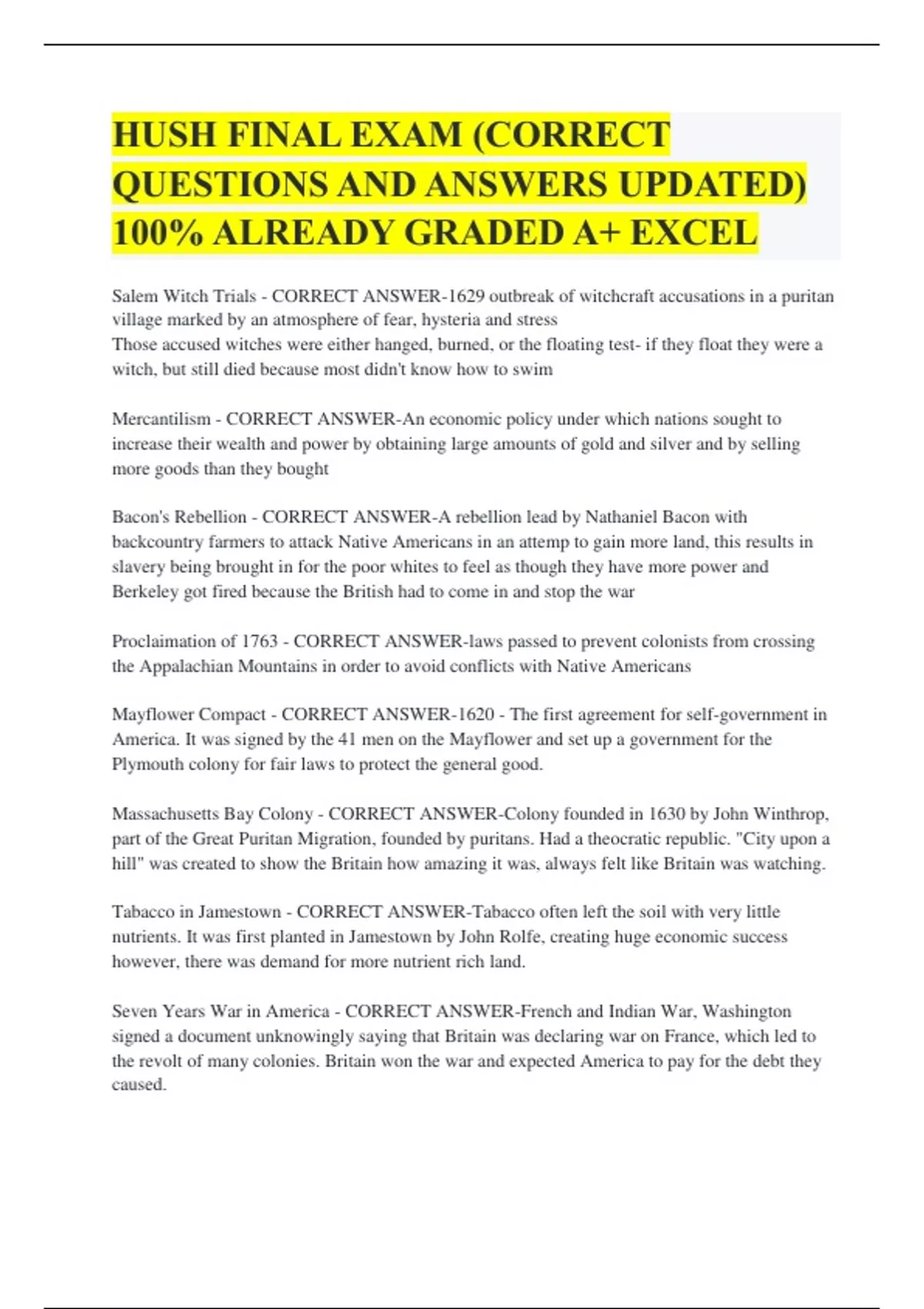 HUSH FINAL EXAM (CORRECT QUESTIONS AND ANSWERS UPDATED) 100% ALREADY GRADED A+ EXCEL Salem Witch Trials - CORRECT ANSWER-1629 outbreak of witchcraft accusations in a puritan village marked by an atmosphere of fear, hysteria and stress Those accused witches were either hanged, burned, or the floating test- if they float they were a witch, but still died because most didn't know how to swim Mercantilism - CORRECT ANSWER-An economic policy under which nations sought to increase their wealth and power by obtaining large amounts of gold and silver and by selling more goods than they bought Bacon's Rebellion - CORRECT ANSWER-A rebellion lead by Nathaniel Bacon with backcountry farmers to attack Native Americans in an attemp to gain more land, this results in slavery being brought in for the poor whites to feel as though they have more power and Berkeley got fired because the British had to come in and stop the war Proclaimation of 1763 - CORRECT ANSWER-laws passed to prevent colonists from crossing the Appalachian Mountains in order to avoid conflicts with Native Americans Mayflower Compact - CORRECT ANSWER-1620 - The first agreement for self-government in America. It was signed by the 41 men on the Mayflower and set up a government for the Plymouth colony for fair laws to protect the general good. Massachusetts Bay Colony - CORRECT ANSWER-Colony founded in 1630 by John Winthrop, part of the Great Puritan Migration, founded by puritans. Had a theocratic republic. "City upon a hill" was created to show the Britain how amazing it was, always felt like Britain was watching. Tabacco in Jamestown - CORRECT ANSWER-Tabacco often left the soil with very little nutrients. It was first planted in Jamestown by John Rolfe, creating huge economic success however, there was demand for more nutrient rich land. Seven Years War in America - CORRECT ANSWER-French and Indian War, Washington signed a document unknowingly saying that Britain was declaring war on France, which led to the revolt of many colonies. Britain won the war and expected America to pay for the debt they caused. Pennsylvania - CORRECT ANSWER-William Penn was granted a colony by the king "The Holy Experiment" Quakers- society of friends, hated by Britain, valued equality and fairness especially in business, tolerant-accepted all religions and races to come into the colony (The King gave William Penn the colony in order for the Quakers to leave Britain)