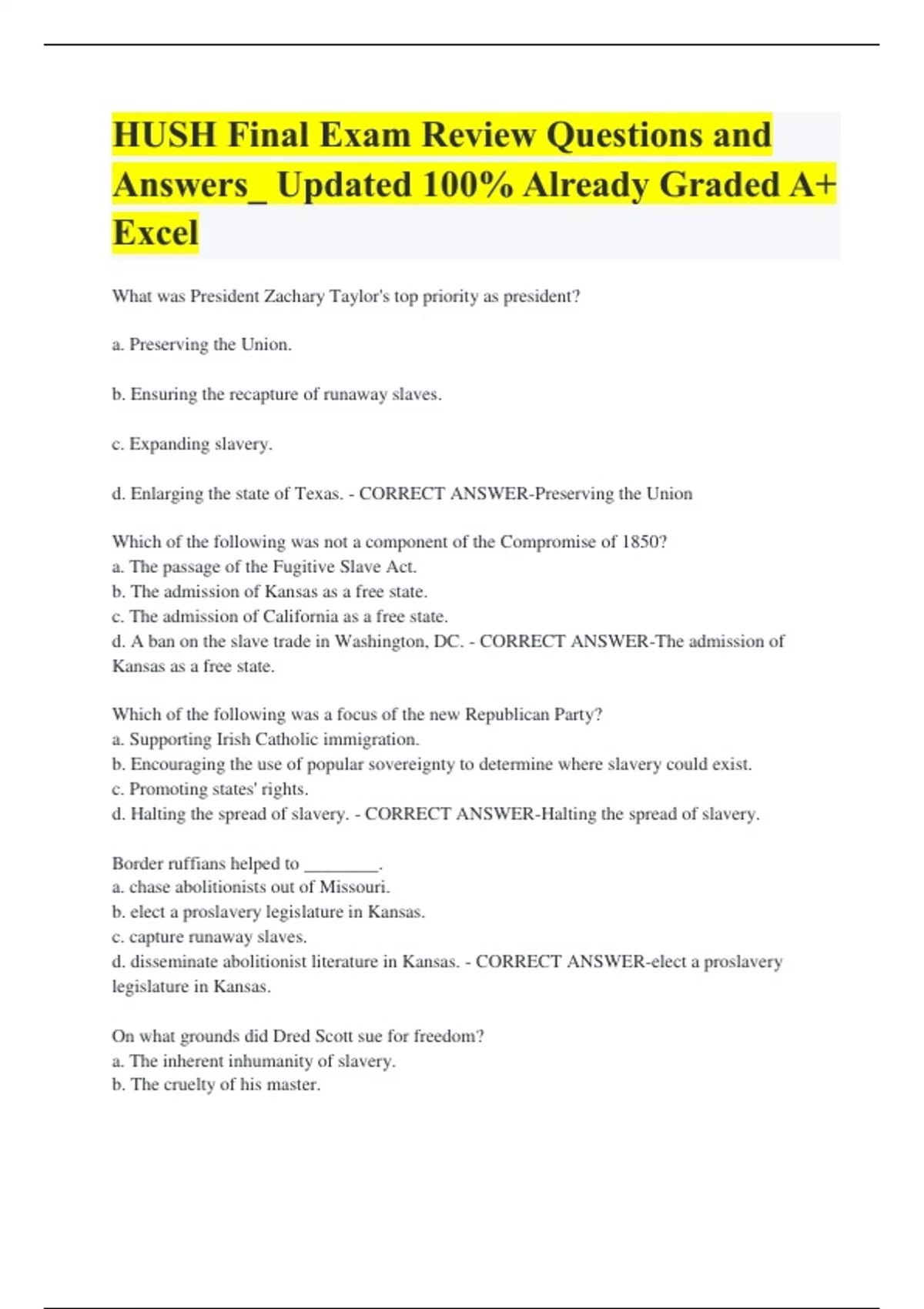 HUSH Final Exam Review Questions and Answers_ Updated 100% Already Graded A+ Excel What was President Zachary Taylor's top priority as president? a. Preserving the Union. b. Ensuring the recapture of runaway slaves. c. Expanding slavery. d. Enlarging the state of Texas. - CORRECT ANSWER-Preserving the Union Which of the following was not a component of the Compromise of 1850? a. The passage of the Fugitive Slave Act. b. The admission of Kansas as a free state. c. The admission of California as a free state. d. A ban on the slave trade in Washington, DC. - CORRECT ANSWER-The admission of Kansas as a free state. Which of the following was a focus of the new Republican Party? a. Supporting Irish Catholic immigration. b. Encouraging the use of popular sovereignty to determine where slavery could exist. c. Promoting states' rights. d. Halting the spread of slavery. - CORRECT ANSWER-Halting the spread of slavery. Border ruffians helped to ________. a. chase abolitionists out of Missouri. b. elect a proslavery legislature in Kansas. c. capture runaway slaves. d. disseminate abolitionist literature in Kansas. - CORRECT ANSWER-elect a proslavery legislature in Kansas. On what grounds did Dred Scott sue for freedom? a. The inherent inhumanity of slavery. b. The cruelty of his master. c. The fact that he had lived in Free states. d. The fact that his family would be torn apart. - CORRECT ANSWER-The fact that he had lived in Free states. Which of the following was not a result of the Lincoln-Douglas debates? a. Douglas was elected senator of Illinois. b. Lincoln's national profile was raised. c. Citizens in both the North and South followed the debates closely. d. Lincoln successfully defended the principle of popular sovereignty. - CORRECT ANSWER-Lincoln successfully defended the principle of popular sovereignty. Why did John Brown attack the armory at Harpers Ferry? a. To seize weapons to distribute to slaves for a massive uprising. b. To hold as a military base against proslavery forces. c. In revenge after the sacking of Lawrence. d. To prevent southern states from seceding. - CORRECT ANSWER-To seize weapons to distribute to slaves for a massive uprising. Which of the following did not contribute to Lincoln's victory in the election of 1860? a. The split between northern and southern democrats. b. The defeat of the Whig party. c. Lincoln's improved national standing after his senatorial debates with Stephen Douglas. d. The Constitutional Union party's further splintering the vote. - CORRECT ANSWER-The defeat of the Whig party. Which of the following does not represent a goal of the Confederate States of America? a. to protect slavery from any effort to abolish it b. to protect the domestic slave trade c. to ensure that slavery would be allowed to spread into western territories d. to ensure that the international slave trade would be allowed to continue - CORRECT ANSWER-to ensure that the international slave trade would be allowed to continue Which was not a provision of the Crittenden Compromise? a. that the Five Civilized Tribes would be admitted into the Confederacy b. that the 36°30ʹ line from the Missouri Compromise would be restored and extended c. that Congress would be prohibited from abolishing slavery where it already existed d. that the interstate slave trade would be allowed to continue - CORRECT ANSWER-That the Five Civilized Tribes would be admitted into the Confederacy All the following were strengths of the Union except ________. a. a large population b. substantial industry c. an extensive railroad d. the ability to fight defensively, rather than offensively - CORRECT ANSWER-the ability to fight defensively, rather than offensively All the following were strengths of the Confederacy except ________. a. the ability to wage a defensive war b. shorter supply lines c. the resources of the Upper South states d. a strong navy - CORRECT ANSWER-a strong navy Which of the following did the North not do to mobilize for war? a. institute a military draft b. form a military alliance with Great Britain c. print paper money d. pass the Homestead Act - CORRECT ANSWER-form a military alliance with Great Britain What was General Sherman's objective on his March to the Sea? a. to destroy military and civilian resources wherever possible b. to free black prisoners of war c. to join his army to that of General Grant d. to capture General Robert E. Lee - CORRECT ANSWER-to destroy military and civilian resources wherever possible What was Lincoln's primary goal immediately following the Civil War? a. punishing the rebel states b. improving the lives of former slaves c. reunifying the country