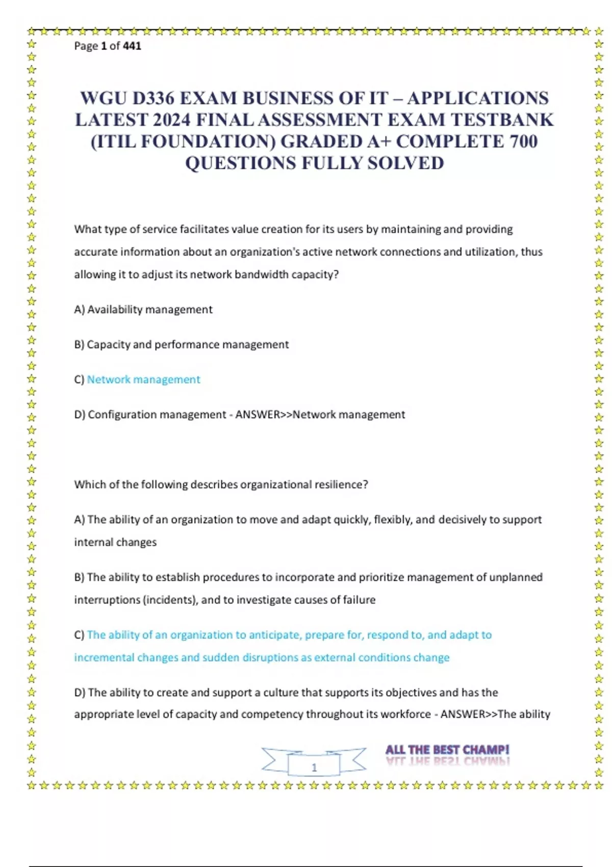 WGU D336 EXAM BUSINESS OF IT – APPLICATIONS LATEST 2024 FINAL ASSESSMENT EXAM TESTBANK (ITIL FOUNDATION) GRADED A+ COMPLETE 700 QUESTIONS FULLY SOLVED