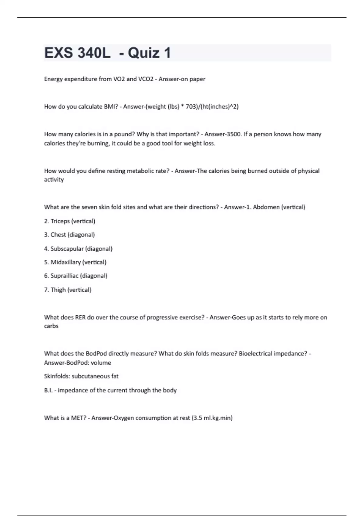 Energy expenditure from VO2 and VCO2 - Answer-on paper How do you calculate BMI? - Answer-(weight (lbs) * 703)/(ht(inches)^2) How many calories is in a pound? Why is that important? - Answer-3500. If a person knows how many calories they're burning, it could be a good tool for weight loss. How would you define resting metabolic rate? - Answer-The calories being burned outside of physical activity What are the seven skin fold sites and what are their directions? - Answer-1. Abdomen (vertical) 2. Triceps (vertical) 3. Chest (diagonal) 4. Subscapular (diagonal) 5. Midaxillary (vertical) 6. Suprailliac (diagonal) 7. Thigh (vertical) What does RER do over the course of progressive exercise? - Answer-Goes up as it starts to rely more on carbs What does the BodPod directly measure? What do skin folds measure? Bioelectrical impedance? - Answer-BodPod: volume Skinfolds: subcutaneous fat B.I. - impedance of the current through the body What is a MET? - Answer-Oxygen consumption at rest (3.5 )What is BMI? What are the classifications? - Answer-Ratio of height and weight Normal: 18.5-24.9 Overweight: 25-29.9 What is meant by essential fat? - Answer-Fat that is needed for the body to undergo its normal functions What is sarcopenia? Why is it important to body composition? - Answer-Muscle loss with aging. When sarcopenia takes muscle away, resting metabolic rates decline What is the purpose of the PAR-Q? - Answer-To detect those who are high risk to see if they're ready for exercise What is the RER representation of fats? CHO? - Answer-Fats: .7 CHO: 1.0 When is BMI most accurate? - Answer-On a population standpoint