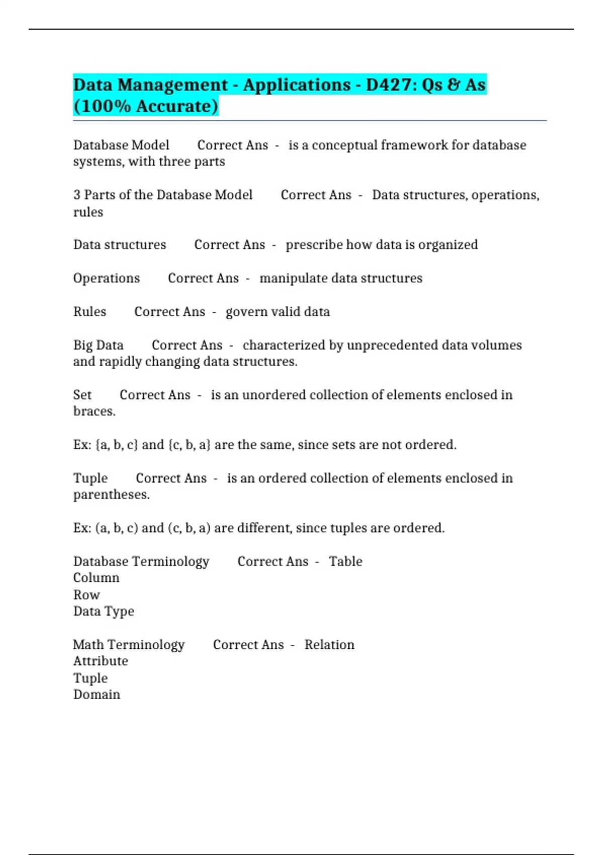 Data Management - Applications - D427: Qs & As (100% Accurate)