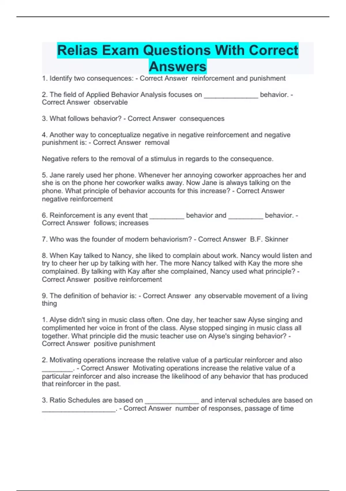 Relias Exam Questions With Correct Answers 1. Identify two consequences: - Correct Answer reinforcement and punishment 2. The field of Applied Behavior Analysis focuses on ______________ behavior. - Correct Answer observable 3. What follows behavior? - Correct Answer consequences 4. Another way to conceptualize negative in negative reinforcement and negative punishment is: - Correct Answer removal Negative refers to the removal of a stimulus in regards to the consequence. 5. Jane rarely used her phone. Whenever her annoying coworker approaches her and she is on the phone her coworker walks away. Now Jane is always talking on the phone. What principle of behavior accounts for this increase? - Correct Answer negative reinforcement 6. Reinforcement is any event that _________ behavior and _________ behavior. - Correct Answer follows; increases 7. Who was the founder of modern behaviorism? - Correct Answer B.F. Skinner 8. When Kay talked to Nancy, she liked to complain about work. Nancy would listen and try to cheer her up by talking with her. The more Nancy talked with Kay the more she complained. By talking with Kay after she complained, Nancy used what principle? - Correct Answer positive reinforcement 9. The definition of behavior is: - Correct Answer any observable movement of a living thing 1. Alyse didn't sing in music class often. One day, her teacher saw Alyse singing and complimented her voice in front of the class. Alyse stopped singing in music class all together. What principle did the music teacher use on Alyse's singing behavior? - Correct Answer positive punishment 2. Motivating operations increase the relative value of a particular reinforcer and also ________. - Correct Answer Motivating operations increase the relative value of a particular reinforcer and also increase the likelihood of any behavior that has produced that reinforcer in the past. 3. Ratio Schedules are based on ______________ and interval schedules are based on ___________________. - Correct Answer number of