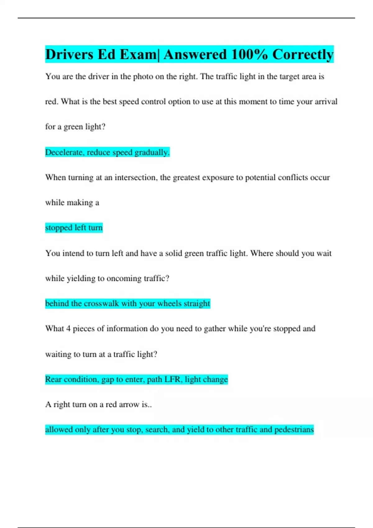 Drivers Ed Exam| Answered 100% Correctly You are the driver in the photo on the right. The traffic light in the target area is red. What is the best speed control option to use at this moment to time your arrival for a green light? Decelerate, reduce speed gradually. When turning at an intersection, the greatest exposure to potential conflicts occur while making a stopped left turn You intend to turn left and have a solid green traffic light. Where should you wait while yielding to oncoming traffic? behind the crosswalk with your wheels straight What 4 pieces of information do you need to gather while you're stopped and waiting to turn at a traffic light? Rear condition, gap to enter, path LFR, light change A right turn on a red arrow is.. allowed only after you stop, search, and yield to other traffic and pedestrians A flashing yellow light means you are required to yield to oncoming traffic and pedestrians, then proceed only when clear What is the best speed control option to use when approaching a stale green traffic light