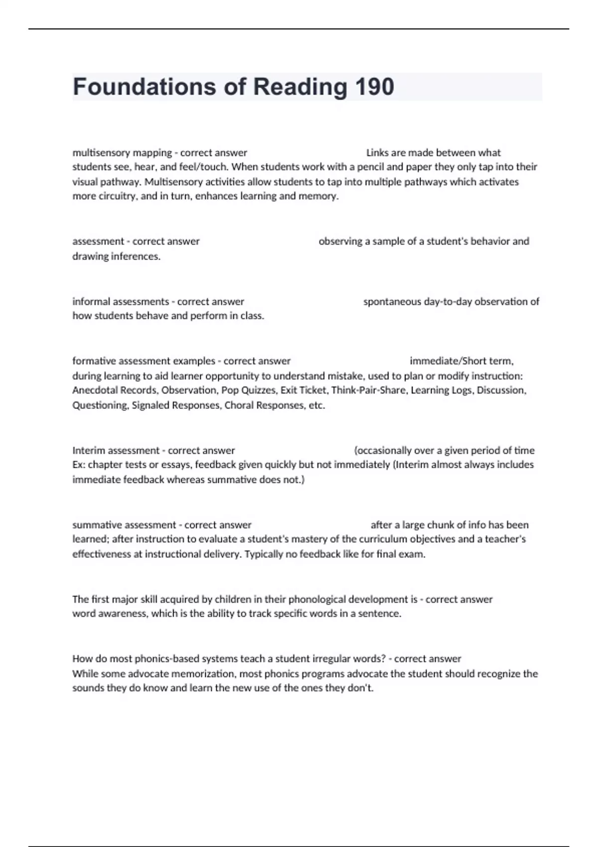 Foundations of Reading 190 Practice Guide Question And Correct Answers.