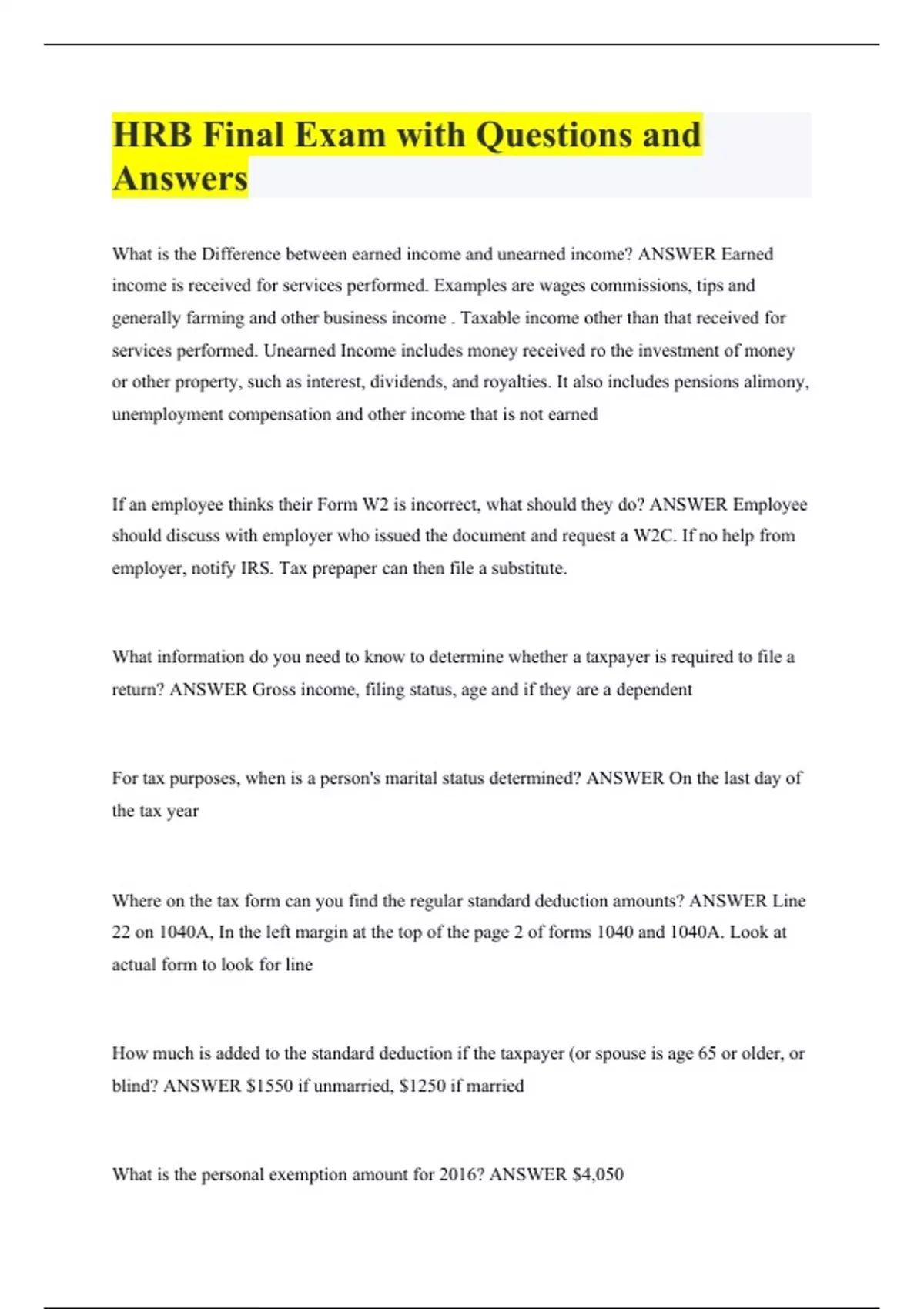 HRB Final Exam with Questions and Answers What is the Difference between earned income and unearned income? ANSWER Earned income is received for services performed. Examples are wages commissions, tips and generally farming and other business income . Taxable income other than that received for services performed. Unearned Income includes money received ro the investment of money or other property, such as interest, dividends, and royalties. It also includes pensions alimony, unemployment compensation and other income that is not earned If an employee thinks their Form W2 is incorrect, what should they do? ANSWER Employee should discuss with employer who issued the document and request a W2C. If no help from employer, notify IRS. Tax prepaper can then file a substitute. What information do you need to know to determine whether a taxpayer is required to file a return? ANSWER Gross income, filing status, age and if they are a dependent For tax purposes, when is a person's marital status determined? ANSWER On the last day of the tax year Where on the tax form can you find the regular standard deduction amounts? ANSWER Line 22 on 1040A, In the left margin at the top of the page 2 of forms 1040 and 1040A. Look at actual form to look for line How much is added to the standard deduction if the taxpayer (or spouse is age 65 or older, or blind? ANSWER $1550 if unmarried, $1250 if married What is the personal exemption amount for 2016? ANSWER $4,050