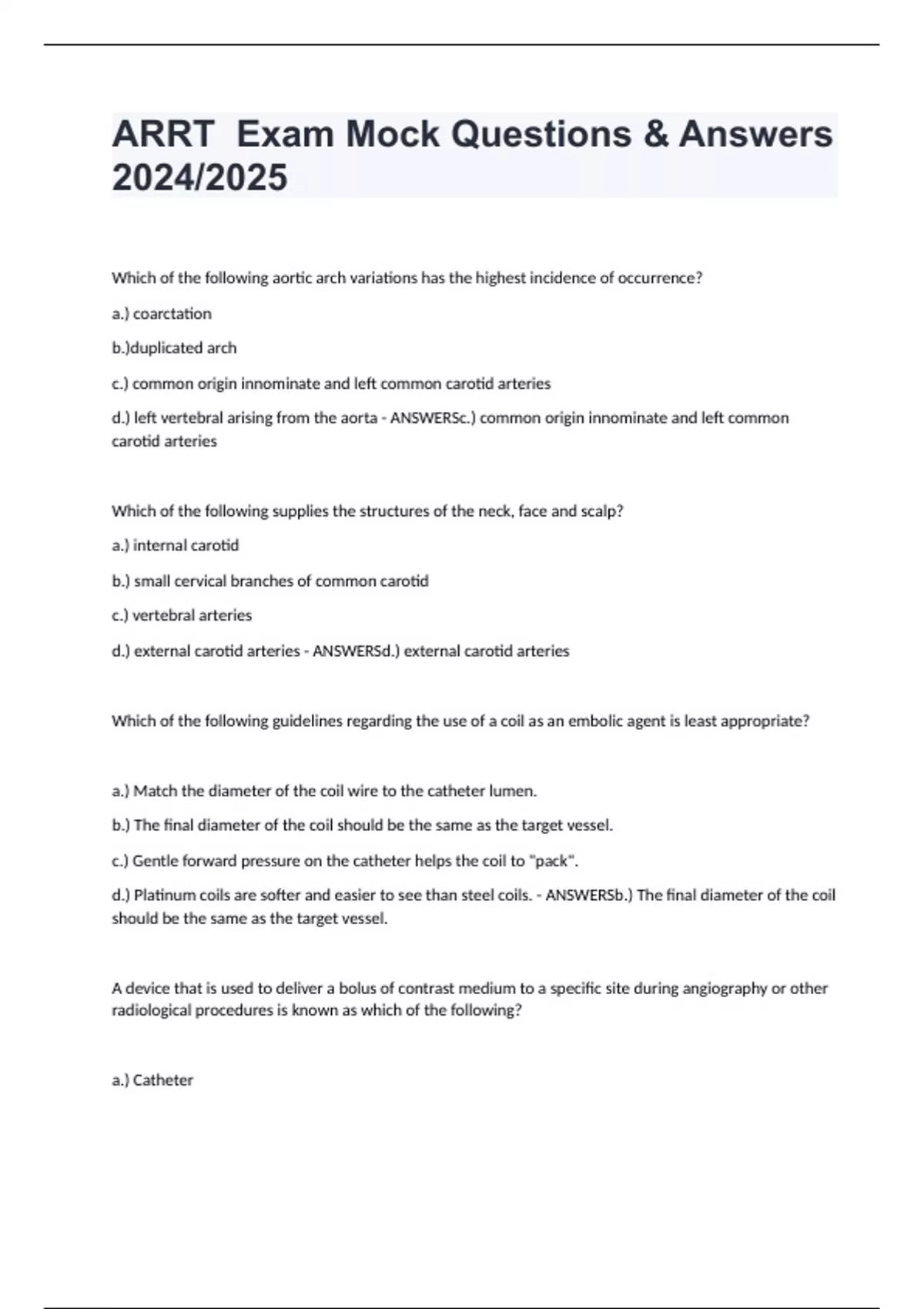 ARRT Exam Mock Questions & Answers 2024/2025 Which of the following aortic arch variations has the highest incidence of occurrence? a.) coarctation b.)duplicated arch c.) common origin innominate and left common carotid arteries d.) left vertebral arising from the aorta - ANSWERSc.) common origin innominate and left common carotid arteries Which of the following supplies the structures of the neck, face and scalp? a.) internal carotid b.) small cervical branches of common carotid c.) vertebral arteries d.) external carotid arteries - ANSWERSd.) external carotid arteries Which of the following guidelines regarding the use of a coil as an embolic agent is least appropriate? a.) Match the diameter of the coil wire to the catheter lumen. b.) The final diameter of the coil should be the same as the target vessel. c.) Gentle forward pressure on the catheter helps the coil to "pack". d.) Platinum coils are softer and easier to see than steel coils. - ANSWERSb.) The final diameter of the coil should be the same as the target vessel. A device that is used to deliver a bolus of contrast medium to a specific site during angiography or other radiological procedures is known as which of the following? a.) Catheter
