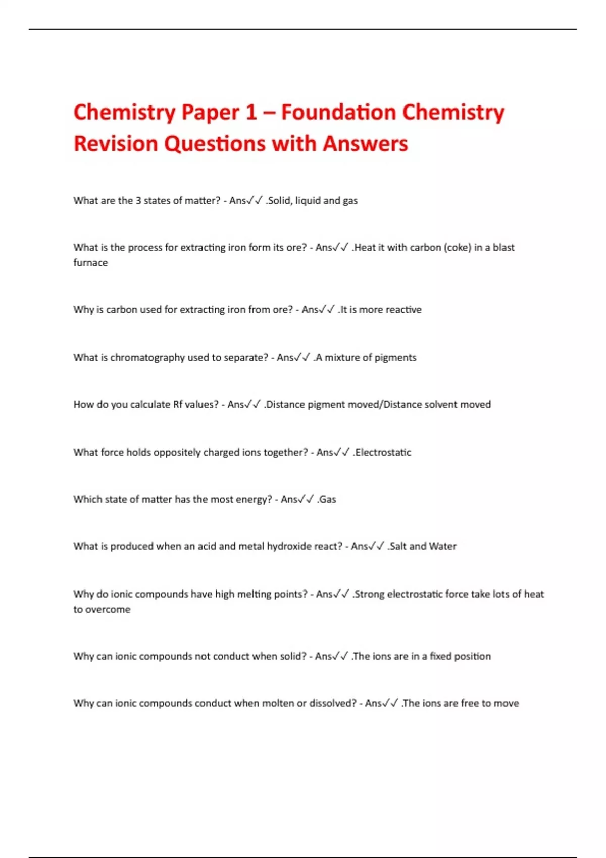 Chemistry Paper 1 – Foundation Chemistry Revision Questions with Answer
