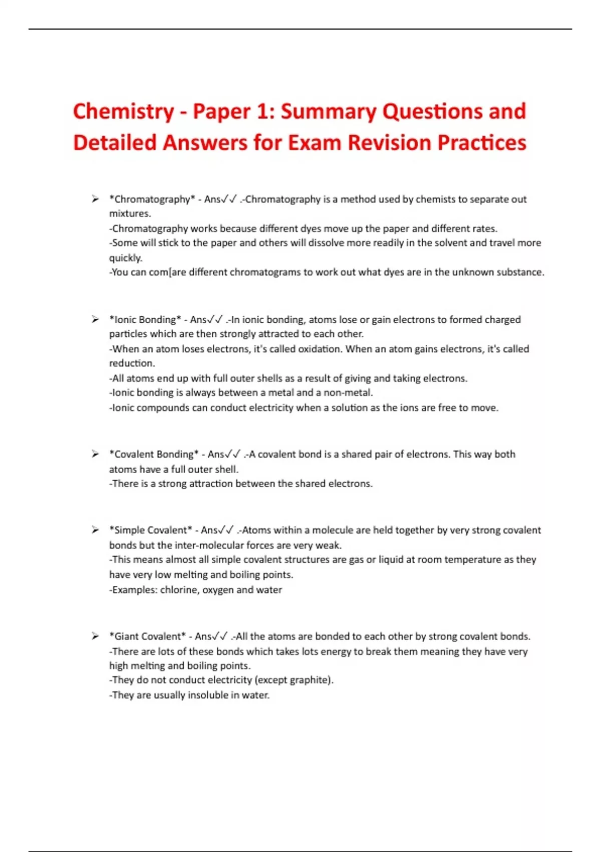 Chemistry - Paper 1: Summary Questions and Detailed Answers for Exam Revision Practices
