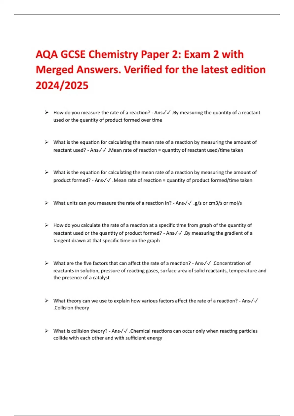 How do you measure the rate of a reaction? - Ans .By measuring the quantity of a reactant used or the quantity of product formed over time What is the equation for calculating the mean rate of a reaction by measuring the amount of reactant used? - Ans .Mean rate of reaction = quantity of reactant used/time taken What is the equation for calculating the mean rate of a reaction by measuring the amount of product formed? - Ans .Mean rate of reaction = quantity of product formed/time taken What units can you measure the rate of a reaction in? - Ans .g/s or cm3/s or mol/s How do you calculate the rate of a reaction at a specific time from graph of the quantity of reactant used or the quantity of product formed? - Ans .By measuring the gradient of a tangent drawn at that specific time on the graph What are the five factors that can affect the rate of a reaction? - Ans .Concentration of reactants in solution, pressure of reacting gases, surface area of solid reactants, temperature and the presence of a catalyst What theory can we use to explain how various factors affect the rate of a reaction? - Ans .Collision theory What is collision theory? - Ans .Chemical reactions can occur only when reacting particles collide with each other and with sufficient energy What is the activation energy of a reaction? - Ans .The minimum amount of energy that particles must have to react According to collision theory why does increasing concentration of reactant in solution increase the rate of the reaction? - Ans .It increases the frequency of collisions and so increases the rate of reaction According to collision theory why does increasing the pressure of reacting gases increase the rate of the reaction? - Ans .It increases the frequency of collisions and so increases the rate of reaction According to collision theory why does increasing the surface area of solid reactants in solution increase the rate of the reaction? - Ans .It increases the frequency of collisions and so increases the rate of reaction According to collision theory why does increasing temperature increase the rate of the reaction? - Ans .It increases the frequency of collisions and makes the collision more energetic and so increases the rate of reaction How do you increase the surface area of a solid reactant? - Ans .Grind it into a powder that has smaller particle size What effect does increasing the temperature of a reaction by 10°C have on the rate of a reaction? - Ans .It doubles it What is a catalyst? - Ans .A chemical that changes the rate of a chemical reaction but is not used up in the reaction How do catalysts increase the rate of a reaction? - Ans .By providing a different pathway for the reaction that has a lower activation energy How do you know in a reaction that a chemical is used in a reaction is a catalyst? - Ans .It is not included in the chemical equation for the reaction What is a reversible reaction? - Ans .Where the products of a chemical reaction can react to produce the original reactant