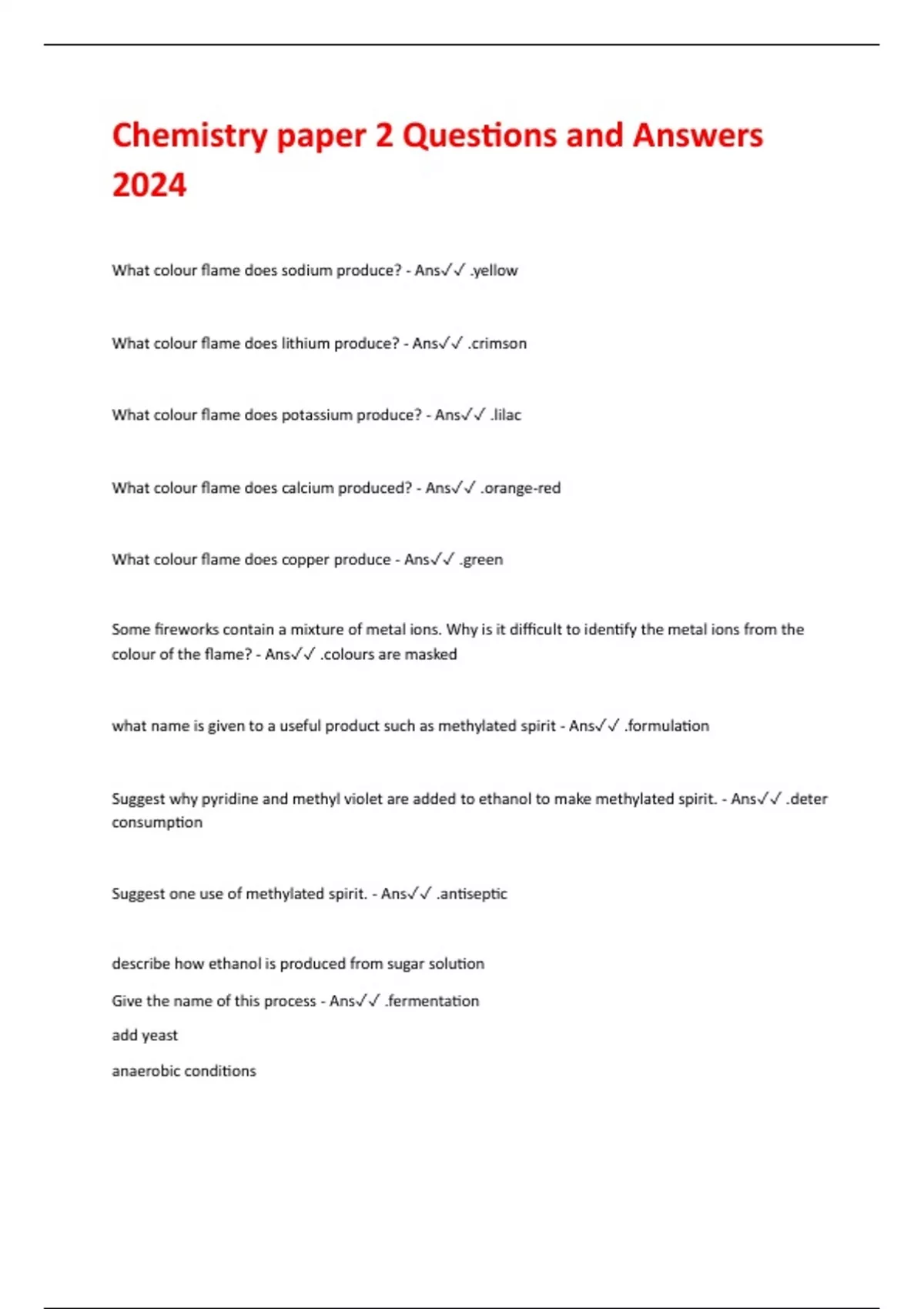 What colour flame does sodium produce? - Ans .yellow What colour flame does lithium produce? - Ans .crimson What colour flame does potassium produce? - Ans .lilac What colour flame does calcium produced? - Ans .orange-red What colour flame does copper produce - Ans .green Some fireworks contain a mixture of metal ions. Why is it difficult to identify the metal ions from the colour of the flame? - Ans .colours are masked what name is given to a useful product such as methylated spirit - Ans .formulation Suggest why pyridine and methyl violet are added to ethanol to make methylated spirit. - Ans .deter consumption Suggest one use of methylated spirit. - Ans .antiseptic describe how ethanol is produced from sugar solution Give the name of this process - Ans .fermentation add yeast anaerobic conditions