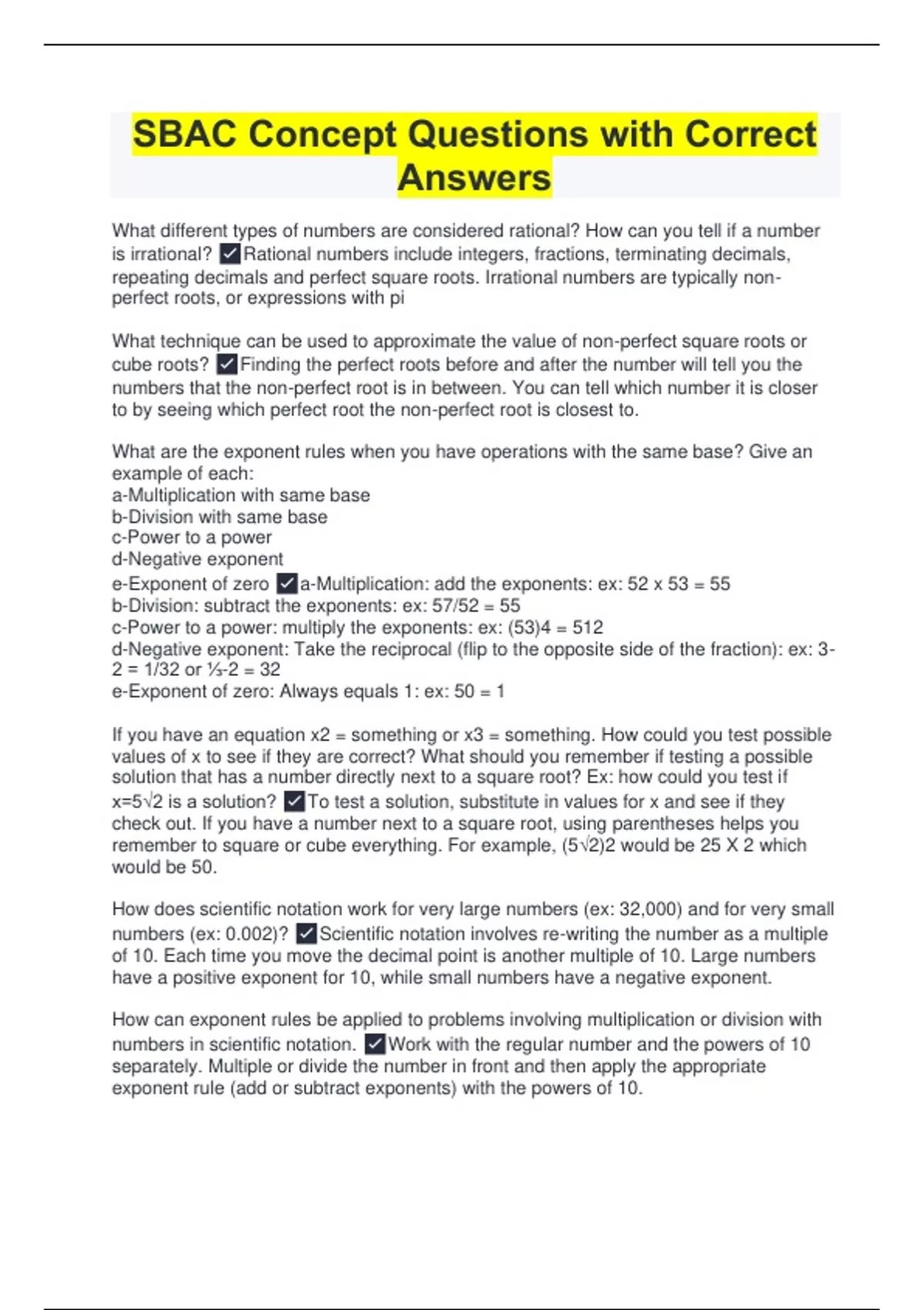 What different types of numbers are considered rational? How can you tell if a number is irrational? Rational numbers include integers, fractions, terminating decimals, repeating decimals and perfect square roots. Irrational numbers are typically non-perfect roots, or expressions with pi What technique can be used to approximate the value of non-perfect square roots or cube roots? Finding the perfect roots before and after the number will tell you the numbers that the non-perfect root is in between. You can tell which number it is closer to by seeing which perfect root the non-perfect root is closest to. What are the exponent rules when you have operations with the same base? Give an example of each: a-Multiplication with same base b-Division with same base c-Power to a power d-Negative exponent e-Exponent of zero a-Multiplication: add the exponents: ex: 52 x 53 = 55 b-Division: subtract the exponents: ex: 57/52 = 55 c-Power to a power: multiply the exponents: ex: (53)4 = 512 d-Negative exponent: Take the reciprocal (flip to the opposite side of the fraction): ex: 3-2 = 1/32 or ⅓-2 = 32 e-Exponent of zero: Always equals 1: ex: 50 = 1 If you have an equation x2 = something or x3 = something. How could you test possible values of x to see if they are correct? What should you remember if testing a possible solution that has a number directly next to a square root? Ex: how could you test if x=5√2 is a solution? To test a solution, substitute in values for x and see if they check out. If you have a number next to a square root, using parentheses helps you remember to square or cube everything. For example, (5√2)2 would be 25 X 2 which would be 50. How does scientific notation work for very large numbers (ex: 32,000) and for very small numbers (ex: 0.002)? Scientific notation involves re-writing the number as a multiple of 10. Each time you move the decimal point is another multiple of 10. Large numbers have a positive exponent for 10, while small numbers have a negative exponent. How can exponent rules be applied to problems involving multiplication or division with numbers in scientific notation. Work with the regular number and the powers of 10 separately. Multiple or divide the number in front and then apply the appropriate exponent rule (add or subtract exponents) with the powers of 10.