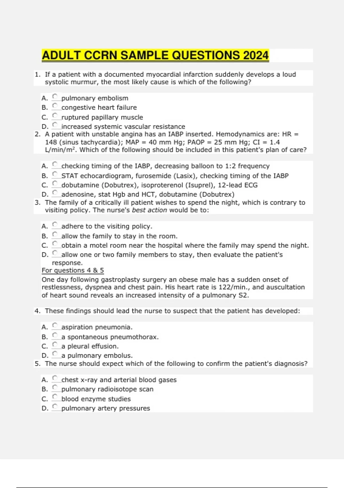 ADULT CCRN SAMPLE QUESTIONS 2024