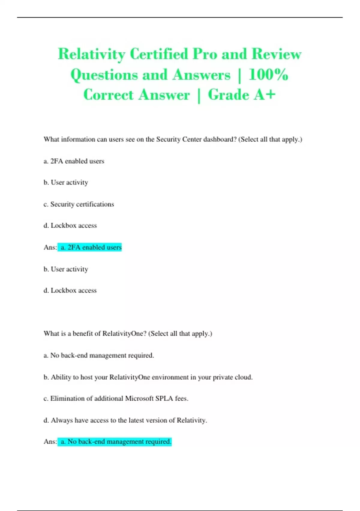 What information can users see on the Security Center dashboard? (Select all that apply.) a. 2FA enabled users b. User activity c. Security certifications d. Lockbox access Ans: a. 2FA enabled users b. User activity d. Lockbox access What is a benefit of RelativityOne? (Select all that apply.) a. No back-end management required. b. Ability to host your RelativityOne environment in your private cloud. c. Elimination of additional Microsoft SPLA fees. d. Always have access to the latest version of Relativity. Ans: a. No back-end management required. c. Elimination of additional Microsoft SPLA fees. d. Always have access to the latest version of Relativity. What is a benefit of RelativityOne? (Select all that apply.) a. Can rely on a strong business continuity and disaster recovery policy. b. Can deploy in multiple geographies. c. Can run the latest version of Relativity software. d. Can run previous versions of Relativit