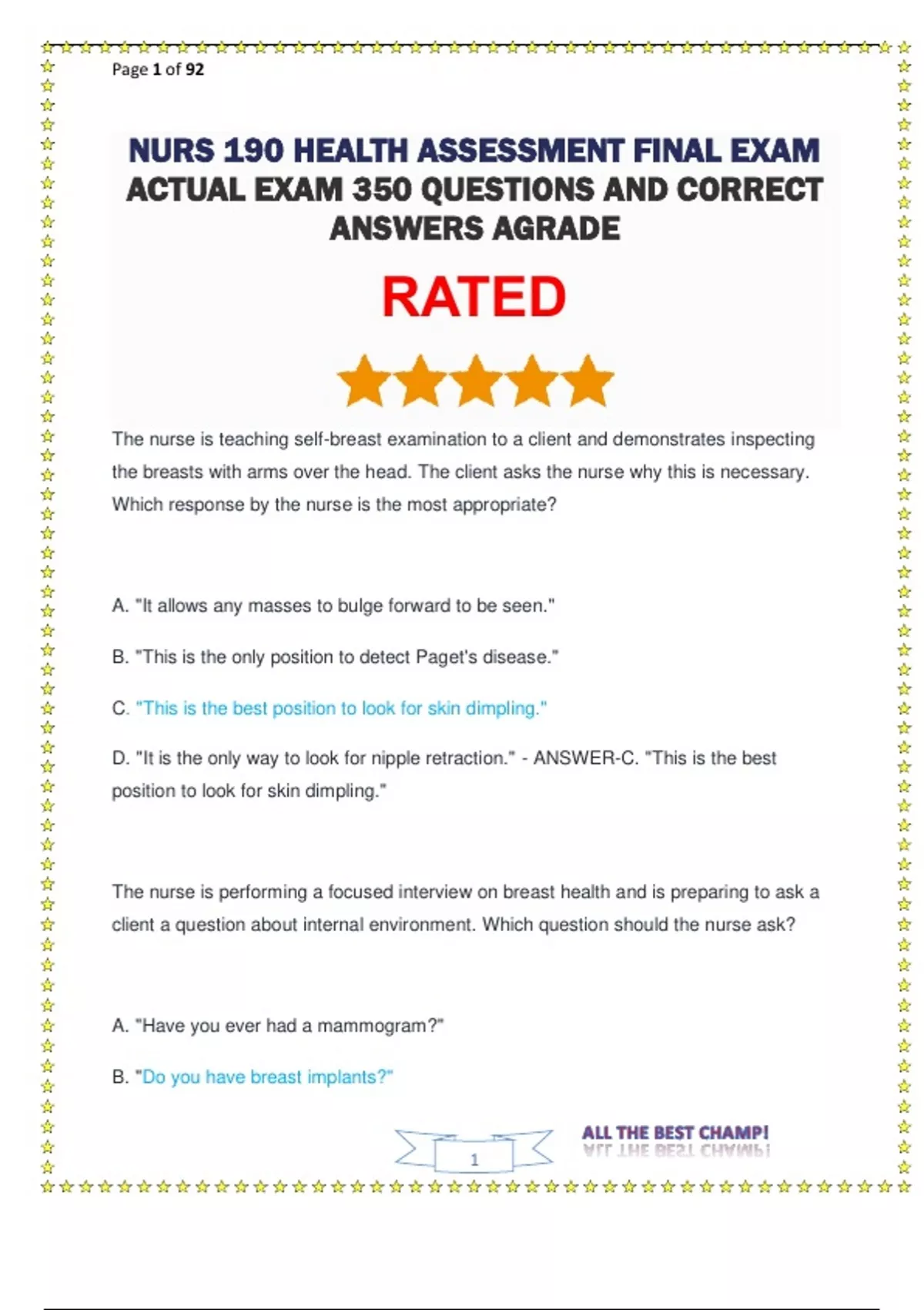 NURS 190 HEALTH ASSESSMENT FINAL EXAM ACTUAL EXAM 350 QUESTIONS AND CORRECT ANSWERS AGRADE