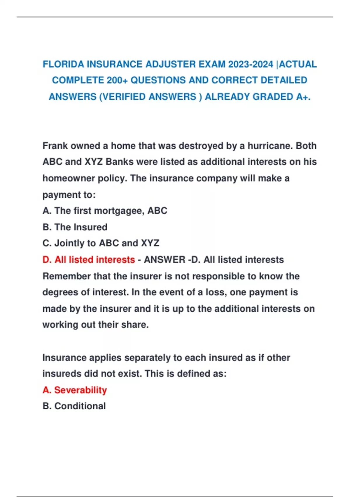 FLORIDA INSURANCE ADJUSTER EXAM |ACTUAL COMPLETE 200+ QUESTIONS AND CORRECT DETAILED ANSWERS (VERIFIED ANSWERS ) ALREADY GRADED A+. FLORIDA INSURANCE ADJUSTER EXAM |ACTUAL COMPLETE 200+ QUESTIONS AND CORRECT DETAILED ANSWERS (VERIFIED ANSWERS ) ALREADY GRADED A+. FLORIDA INSURANCE ADJUSTER EXAM |ACTUAL COMPLETE 200+ QUESTIONS AND CORRECT DETAILED ANSWERS (VERIFIED ANSWERS ) ALREADY GRADED A+. FLORIDA INSURANCE ADJUSTER EXAM |ACTUAL COMPLETE 200+ QUESTIONS AND CORRECT DETAILED ANSWERS (VERIFIED ANSWERS ) ALREADY GRADED A+. FLORIDA INSURANCE ADJUSTER EXAM |ACTUAL COMPLETE 200+ QUESTIONS AND CORRECT DETAILED ANSWERS (VERIFIED ANSWERS ) ALREADY GRADED A+. FLORIDA INSURANCE ADJUSTER EXAM |ACTUAL COMPLETE 200+ QUESTIONS AND CORRECT DETAILED ANSWERS (VERIFIED ANSWERS ) ALREADY GRADED A+. FLORIDA INSURANCE ADJUSTER EXAM |ACTUAL COMPLETE 200+ QUESTIONS AND CORRECT DETAILED ANSWERS (VERIFIED ANSWERS ) ALREADY GRADED A+. FLORIDA INSURANCE ADJUSTER EXAM |ACTUAL COMPLETE 200+ QUESTIONS AND CORRECT DETAILED ANSWERS (VERIFIED ANSWERS ) ALREADY GRADED A+. FLORIDA INSURANCE ADJUSTER EXAM |ACTUAL COMPLETE 200+ QUESTIONS AND CORRECT DETAILED ANSWERS (VERIFIED ANSWERS ) ALREADY GRADED A+. FLORIDA INSURANCE ADJUSTER EXAM |ACTUAL COMPLETE 200+ QUESTIONS AND CORRECT DETAILED ANSWERS (VERIFIED ANSWERS ) ALREADY GRADED A+.