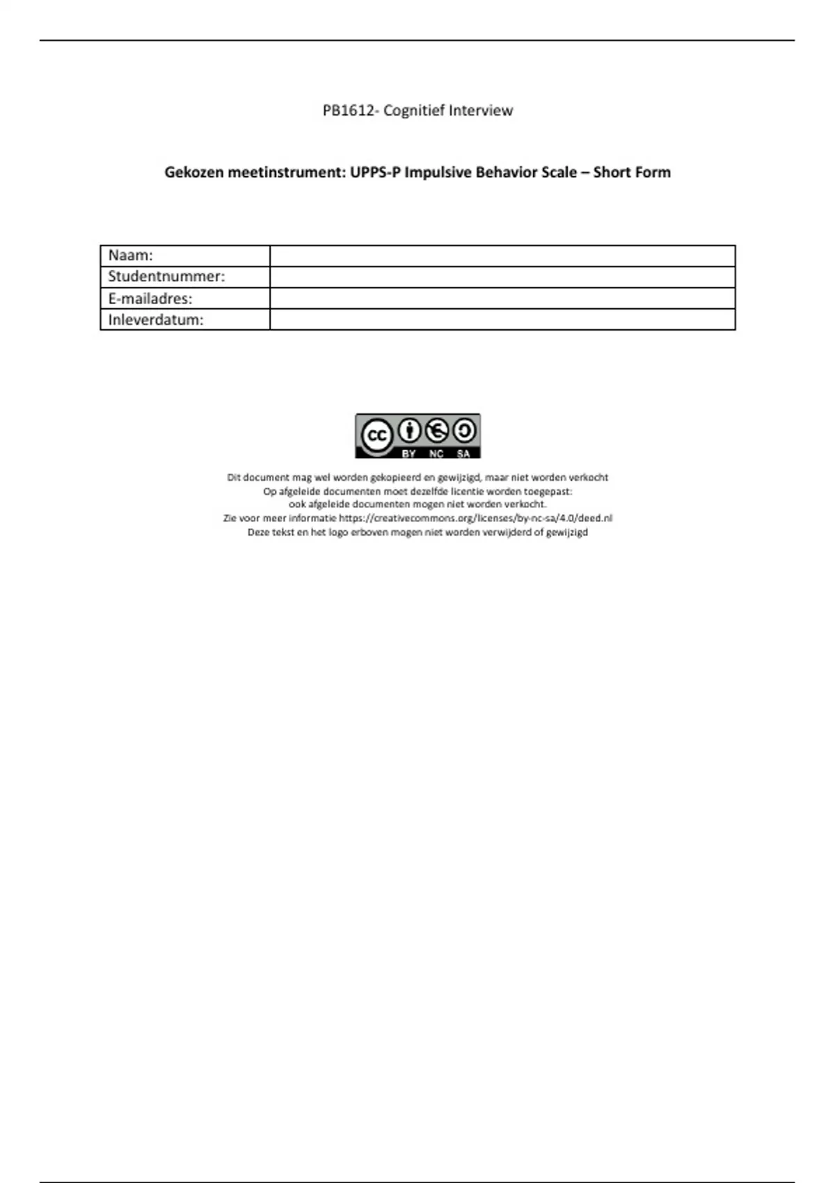 Gekozen meetinstrument: UPPS-P Impulsive Behavior Scale – Short Form