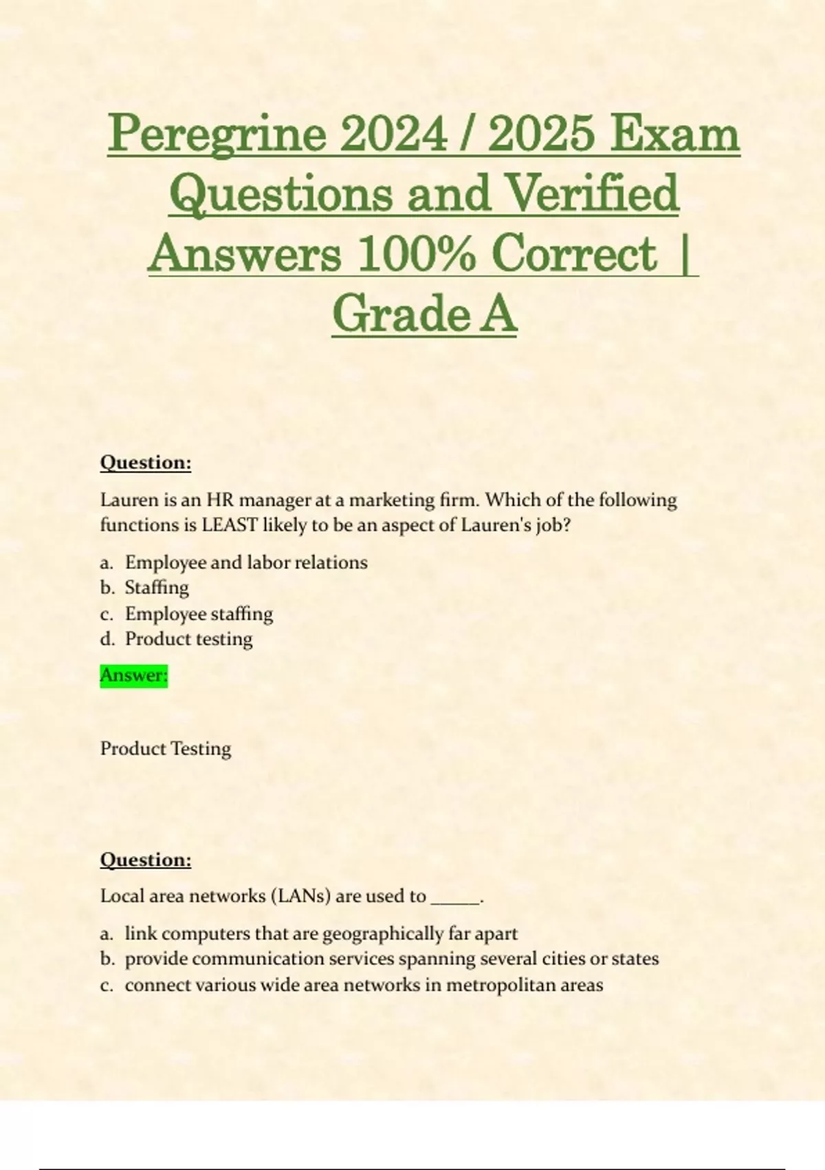 Peregrine 2024 / 2025 Exam Questions and Verified Answers 100% Correct | Grade A Q: Lauren is an HR manager at a marketing firm. Which of the following functions is LEAST likely to be an aspect of Lauren's job? Answer: Employee and labor relations Staffing Employee staffing Product testing Product Testing Q: Local area networks (LANs) are used to _____. Answer: link computers that are geographically far apart provide communication services spanning several cities or states connect various wide area networks in metropolitan areas integrate services to a single building or campus integrate services to a single building or campus Q: n June 2015, American steel companies United States Steel Corp., Nucor Corp., Steel Dynamics Inc., ArcelorMittal USA, AK Steel Corp., and California Steel Industries filed a complaint with the Department of Commerce and the ITC alleging that China (and other countries) were selling steel in the U.S. market at prices lower than their own markets. This practice is known as Answer: Tacit collusion Collusion Price fixing Dumping Dumping Q: Dumping is considered: Answer: Repackaging a product currently being sold in a foreign country. Collecting and destroying products before they contaminate the market for the brand. The sale of an exported product at a price lower than that charged for the same or a like product in the
