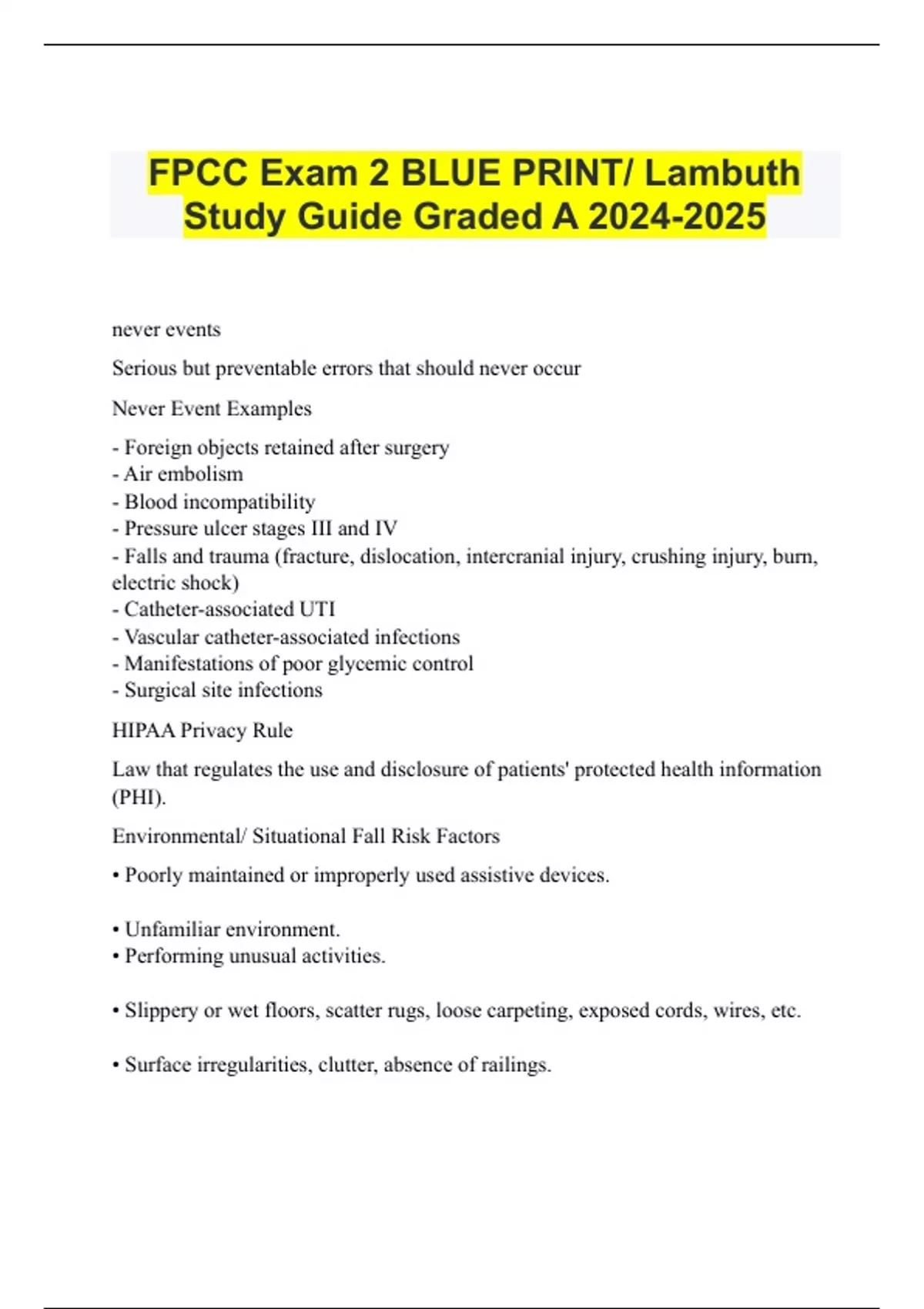 never events Serious but preventable errors that should never occur Never Event Examples - Foreign objects retained after surgery - Air embolism - Blood incompatibility - Pressure ulcer stages III and IV - Falls and trauma (fracture, dislocation, intercranial injury, crushing injury, burn, electric shock) - Catheter-associated UTI - Vascular catheter-associated infections - Manifestations of poor glycemic control - Surgical site infections HIPAA Privacy Rule Law that regulates the use and disclosure of patients' protected health information (PHI). Environmental/ Situational Fall Risk Factors • Poorly maintained or improperly used assistive devices. • Unfamiliar environment. • Performing unusual activities. • Slippery or wet floors, scatter rugs, loose carpeting, exposed cords, wires, etc. • Surface irregularities, clutter, absence of railings. • Unstable furniture, low furniture and furniture without armrests and backrests. • Poor lighting including dim lighting, glare and absence of night lights. • Bathrooms: Low toilets absence of secure grab bars and tubs without bars or non skid strips. Inappropriate placement of grab bars and assistive devices. • Ill fitting clothing • Improper shoes • Presence of tubes, catheters, etc. Intrinsic Patient Factors for Fall Risks • Acute and Chronic illnesses • Metabolic Abnormalities • Arrhythmias • Orthostatic Hypotension • Fainting Episodes (vasovagal) • Sensory deficits/ problems with corrective devices: visual/hearing/ vertigo & dizziness • Dementia with altered judgment • Incontinence • Medications: anesthetics, antipsychotics, antihistamines, anticonvulsants, benzodiazapines, cardiac drugs (diuretics, antihypertensives, calcium channel blockers), hypoglycemics, narcotics and polypharmacy • Musculoskeletal: bone degeneration, osteoporosis, decreased bone density and muscle mass, decreased strength...