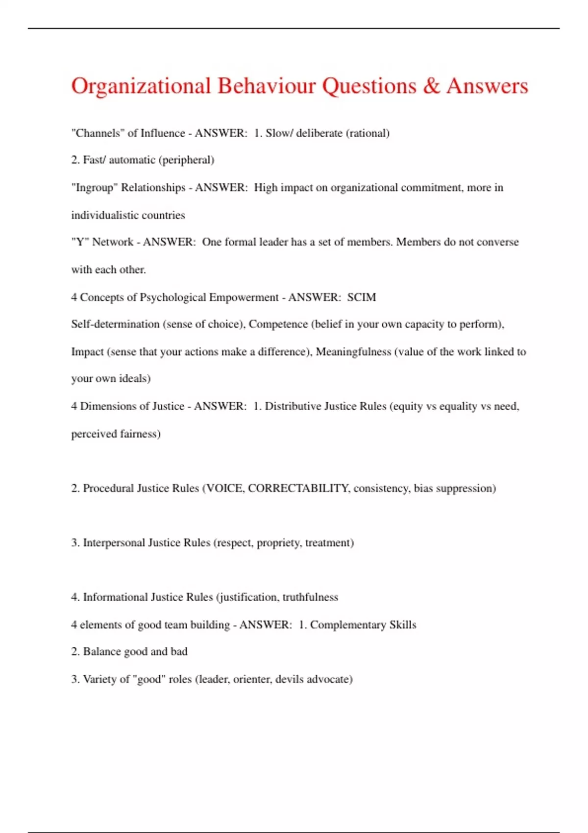 Organizational Behaviour Questions & Answers "Channels" of Influence - ANSWER: 1. Slow/ deliberate (rational) 2. Fast/ automatic (peripheral) "Ingroup" Relationships - ANSWER: High impact on organizational commitment, more in individualistic countries "Y" Network - ANSWER: One formal leader has a set of members. Members do not converse with each other. 4 Concepts of Psychological Empowerment - ANSWER: SCIM Self-determination (sense of choice), Competence (belief in your own capacity to perform), Impact (sense that your actions make a difference), Meaningfulness (value of the work linked to your own ideals) 4 Dimensions of Justice - ANSWER: 1. Distributive Justice Rules (equity vs equality vs need, perceived fairness) 2. Procedural Justice Rules (VOICE, CORRECTABILITY, consistency, bias suppression) 3. Interpersonal Justice Rules (respect, propriety, treatment) 4. Informational Justice Rules (justification, truthfulness 4 elements of good team building - ANSWER: 1. Complementary Skills 2. Balance good and bad 3. Variety of "good" roles (leader, orienter, devils advocate) 4. Become a gestalt (bigger than the sum of parts) 4 Stages of Life Cycle Theory - ANSWER: 1. Telling (define roles, high initiating and low consideration) 2. Selling (give support and encouragement as he work is harder than expected, high initiating and high consideration) 3. Participating (give support to self-manage, low initiating and high consideration) 4. Delegating (ensure work is on track but let them be, low initiating and low consideration) 5 Types of Power - ANSWER: Organizational