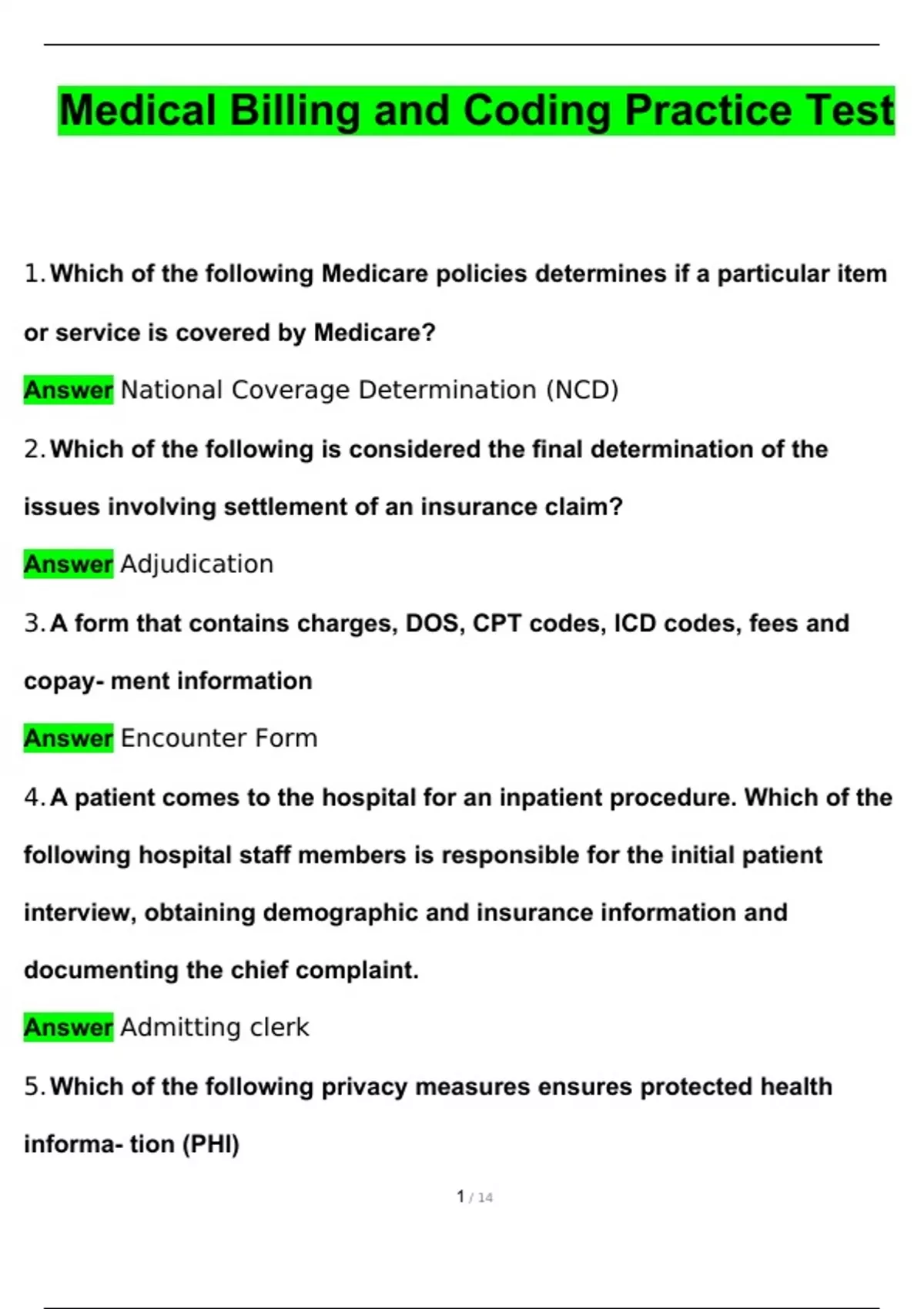 Medical Billing and Coding Practice Test 2024 Questions with 100% Correct Answers | Verified | Latest Update
