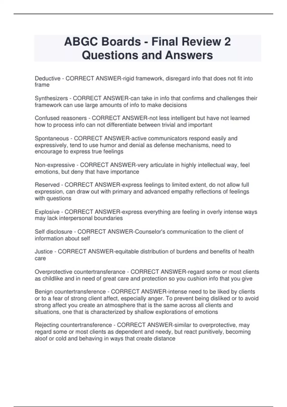ABGC Boards - Final Review 2 Questions and Answers Deductive - CORRECT ANSWER-rigid framework, disregard info that does not fit into frame Synthesizers - CORRECT ANSWER-can take in info that confirms and challenges their framework can use large amounts of info to make decisions Confused reasoners - CORRECT ANSWER-not less intelligent but have not learned how to process info can not differentiate between trivial and important Spontaneous - CORRECT ANSWER-active communicators respond easily and expressively, tend to use humor and denial as defense mechanisms, need to encourage to express true feelings Non-expressive - CORRECT ANSWER-very articulate in highly intellectual way, feel emotions, but deny that have importance Reserved - CORRECT ANSWER-express feelings to limited extent, do not allow full expression, can draw out with primary and advanced empathy reflections of feelings with questions Explosive - CORRECT ANSWER-express everything are feeling in overly intense ways may lack interpersonal boundaries Self disclosure - CORRECT ANSWER-Counselor's communication to the client of information about self Justice - CORRECT ANSWER-equitable distribution of burdens and benefits of health care Overprotective countertransferance - CORRECT ANSWER-regard some or most clients as childlike and in need of great care and protection so you cushion info that you give Benign countertransference - CORRECT ANSWER-intense need to be liked by clients or to a fear of strong client affect, especially anger. To prevent being disliked or to avoid strong affect you create an atmosphere that is the same across all clients and situations, one that is characterized by shallow explorations of emotions Rejecting countertransference - CORRECT ANSWER-similar to overprotective, may regard some or most clients as dependent and needy, but react punitively, becoming aloof or cold and behaving in ways that create distance