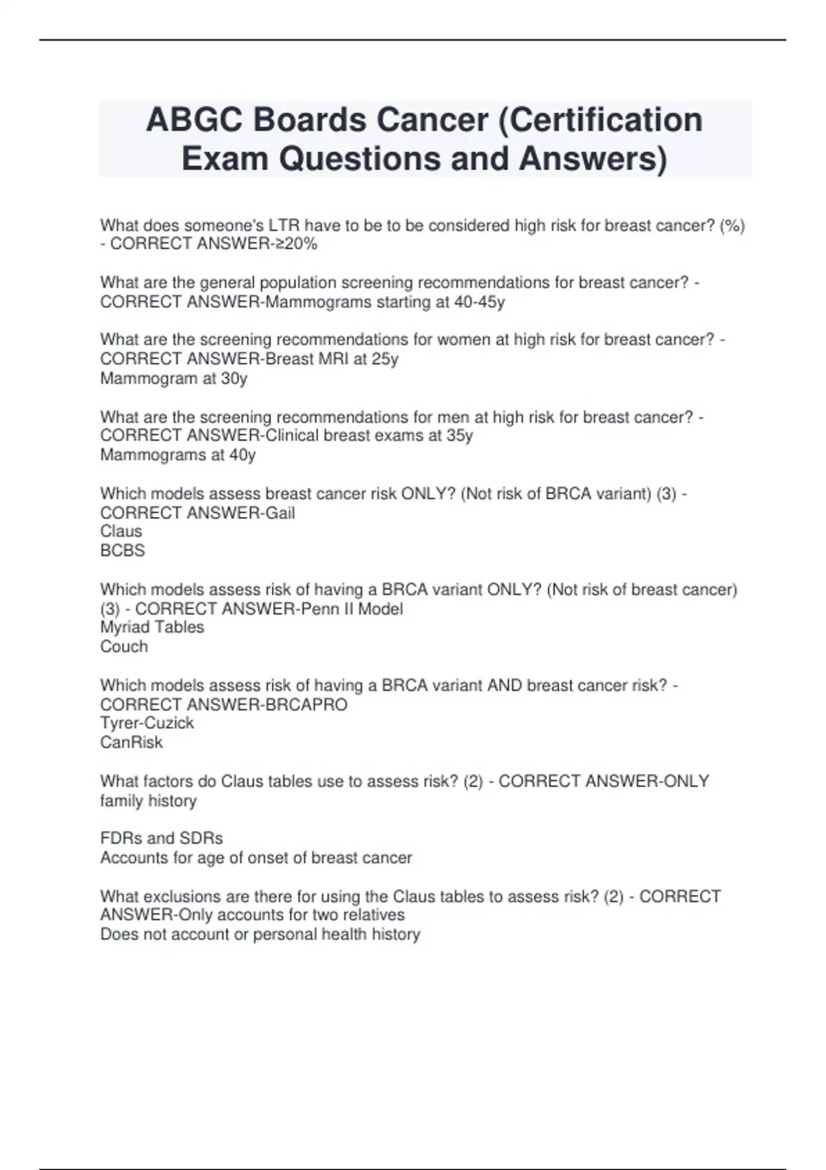 ABGC Boards Cancer (Certification Exam Questions and Answers) What does someone's LTR have to be to be considered high risk for breast cancer? (%) - CORRECT ANSWER-≥20% What are the general population screening recommendations for breast cancer? - CORRECT ANSWER-Mammograms starting at 40-45y What are the screening recommendations for women at high risk for breast cancer? - CORRECT ANSWER-Breast MRI at 25y Mammogram at 30y What are the screening recommendations for men at high risk for breast cancer? - CORRECT ANSWER-Clinical breast exams at 35y Mammograms at 40y Which models assess breast cancer risk ONLY? (Not risk of BRCA variant) (3) - CORRECT ANSWER-Gail Claus BCBS Which models assess risk of having a BRCA variant ONLY? (Not risk of breast cancer) (3) - CORRECT ANSWER-Penn II Model Myriad Tables Couch Which models assess risk of having a BRCA variant AND breast cancer risk? - CORRECT ANSWER-BRCAPRO Tyrer-Cuzick CanRisk What factors do Claus tables use to assess risk? (2) - CORRECT ANSWER-ONLY family history FDRs and SDRs Accounts for age of onset of breast cancer What exclusions are there for using the Claus tables to assess risk? (2) - CORRECT ANSWER-Only accounts for two relatives Does not account or personal health history What factors does the Gail Model use to assess risk? (5) - CORRECT ANSWERPrimarily non-genetic risk factors FDRs Age @ menarche Age @ first birth # of breast biopsies Race/ethnicity What exclusions are there for using the Gail Model to assess risk? (3) - CORRECT ANSWER-Cannot be used in the following circumstances Women <35 Women with personal history of breast cancer Women with BRCA variant What factors does the BCSC Risk Calculator use to assess risk? (6) - CORRECT ANSWER-Primarily non-genetic factors AND breast density FDRs Age @ menarche Age @ first birth # of breast biopsies Race/ethnicity Breast density What is the limitation of the BCSC Risk Calculator? - CORRECT ANSWER-No LTR calculated What is the major difference between the Gail Model and the BCSC Risk Calculator in terms of what factors they use to assess risk? - CORRECT ANSWER-BCSC Risk Calculator takes breast density into accoun