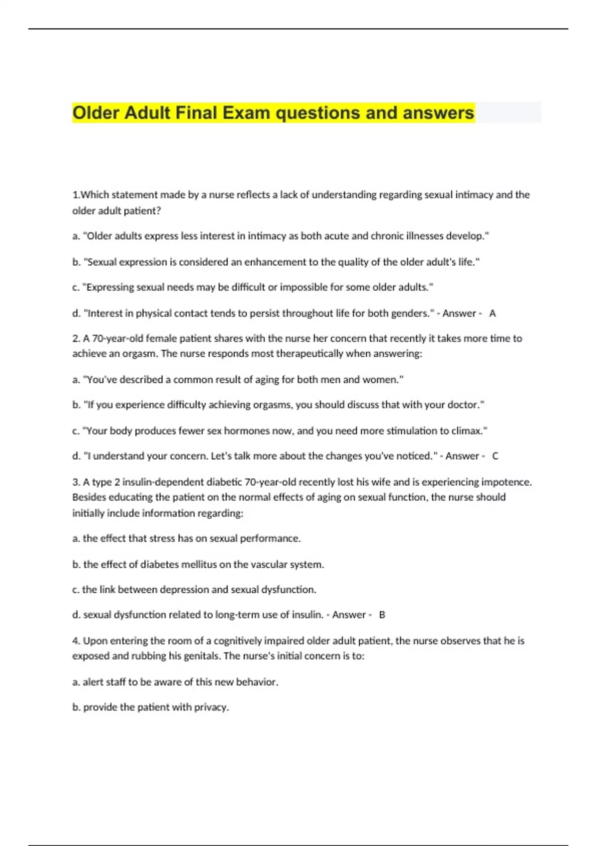 1.Which statement made by a nurse reflects a lack of understanding regarding sexual intimacy and the