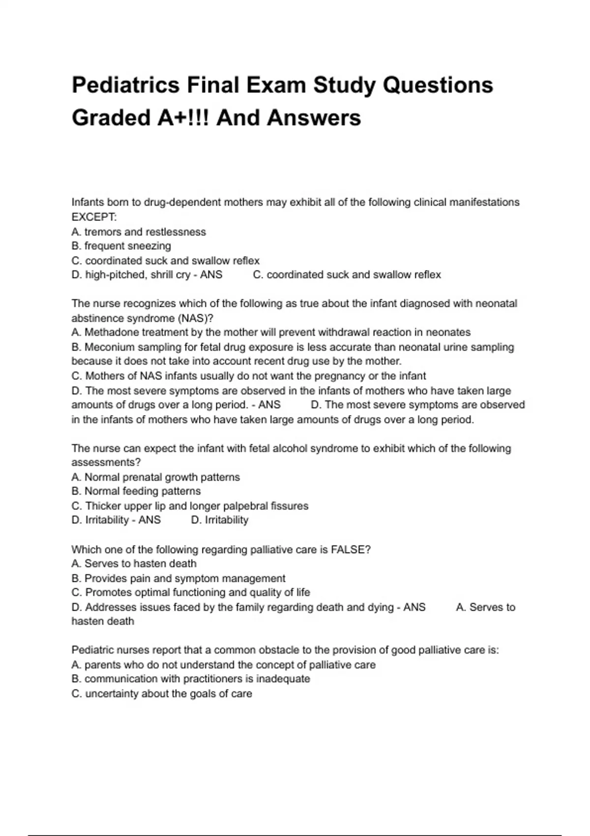 Infants born to drug-dependent mothers may exhibit all of the following clinical manifestations EXCEPT: A. tremors and restlessness B. frequent sneezing C. coordinated suck and swallow reflex D. high-pitched, shrill cry - ANS C. coordinated suck and swallow reflex The nurse recognizes which of the following as true about the infant diagnosed with neonatal abstinence syndrome (NAS)? A. Methadone treatment by the mother will prevent withdrawal reaction in neonates B. Meconium sampling for fetal drug exposure is less accurate than neonatal urine sampling because it does not take into account recent drug use by the mother. C. Mothers of NAS infants usually do not want the pregnancy or the infant D. The most severe symptoms are observed in the infants of mothers who have taken large amounts of drugs over a long period. - ANS D. The most severe symptoms are observed in the infants of mothers who have taken large amounts of drugs over a long period. The nurse can expect the infant with fetal alcohol syndrome to exhibit which of the following assessments? A. Normal prenatal growth patterns B. Normal feeding patterns C. Thicker upper lip and longer palpebral fissures D. Irritability - ANS D. Irritability Which one of the following regarding palliative care is FALSE? A. Serves to hasten death B. Provides pain and symptom management C. Promotes optimal functioning and quality of life D. Addresses issues faced by the family regarding death and dying - ANS A. Serves to hasten death Pediatric nurses report that a common obstacle to the provision of good palliative care is: A. parents who do not understand the concept of palliative care B. communication with practitioners is inadequate C. uncertainty about the goals of care D. the cost of providing palliative care is excessive - ANS C. uncertainty about the goals of care When communicating with dying children, the nurse should remember that: A. older children tend to be concrete thinkers B. when the children can recite facts, they understand the implications of those facts C. if children's questions direct the conversation, the assessment will be incomplete D. games, art and play provide a good means of expression - ANS D. games, art and play provide a good means of expression When assisting parents in supporting their dying child, the nurse should stress the importance of honesty; if parents are honest and openly discuss their fears, the child more likely to: A. discuss his or her fears B. ask fewer distressing questions C. lose his or her sense of hope D. do all of the above - ANS A. discuss his or her fears Fear of the unknown is one of the greatest threats to seriously ill children of which age-group? A. Toddlers B. Preschoolers C. School-age children D. Adolescents - ANS C. School-age children Separation is one of the greatest threats to seriously ill children of which age-group A. Toddlers B. Preschoolers C. School-age children D. Adolescents - ANS A. Toddlers Fear of punishment is one of the greatest threats to seriously ill children of which age-group? A. Toddlers B. Preschoolers C. School-age children D. Adolescents - ANS B. Preschoolers The perceived inability to use their parents for emotional support is one of the greatest threats to seriously ill children of which age-group? A. Toddlers B. Preschoolers C. School-age children D. Adolescents - ANS D. Adolescents Which one of the following age-groups is most likely to suffer negative reactions to an altered body image as a result of life-threatening illness? A. Young children B. School-age children C. Adolescents D. All age-groups are affected equally - ANS C. Adolescents Which one of the following interventions is most important for the dying child? A. emotional support B. preparing parents to deal with fears C. relief from pain D. control of pain - ANS D. control of pain When the parent of a child who is dying tells the nurse the child is in pain, even when the child appears comfortable, the nurse should be sure that: A. as-needed pain control measures are instituted B. pain control is administered on a regular preventative schedule C. parents understand that pain is a physical process D. parents understand that the child is probably in less pain than the parents think - ANS B. pain control is administered on a regular preventative schedule