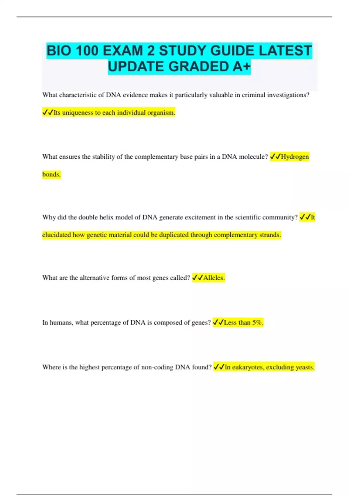 BIO 100 EXAM 2 STUDY GUIDE LATEST UPDATE GRADED A+ What characteristic of DNA evidence makes it particularly valuable in criminal investigations? Its uniqueness to each individual organism. What ensures the stability of the complementary base pairs in a DNA molecule? Hydrogen bonds. Why did the double helix model of DNA generate excitement in the scientific community? It elucidated how genetic material could be duplicated through complementary strands. What are the alternative forms of most genes called? Alleles. In humans, what percentage of DNA is composed of genes? Less than 5%. Where is the highest percentage of non-coding DNA found? In eukaryotes, excluding yeasts. What does the central dogma of molecular biology describe? DNA is transcribed into RNA, which is then translated into protein. The expression of a gene to produce a polypeptide involves which two major steps? Transcription and translation. What sequence of events occurs when DNA is converted into a protein? Transcription followed by translation. In a eukaryotic cell, where do transcription and translation take place? Transcription occurs in the nucleus, while translation occurs in the cytoplasm. Define genotypes and phenotypes. Genotype: The genetic composition or allele combinations. Phenotype: The physical appearance or visible traits, determined by genotypes. What distinguishes mRNA from DNA? mRNA can travel throughout the cell, whereas DNA remains in the nucleus. Additionally, mRNA contains uracil instead of thymine, which is present in DNA. What is transcription? The process of synthesizing RNA from a DNA template. What is translation? The process of decoding an mRNA message into a protein. What are the three nonsense codons, UAA, UAG, and UGA, also known as? Stop codons. What is a frameshift mutation? A mutation that shifts the "reading" frame of the genetic message by inserting or deleting a nucleotide. What is a point mutation? a mutation affecting only one or very few nucleotides in a gene sequence. What important factor can influence mutation rates? size of gene, nucleotide sequence, spontaneous chemical changes During the polymerase chain reaction (PCR), two strands