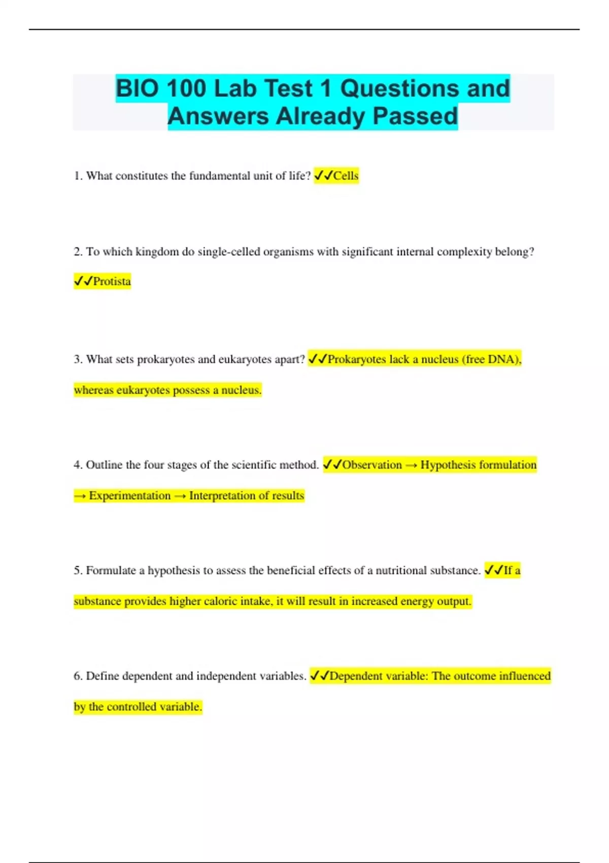 BIO 100 Lab Test 1 Questions and Answers Already Passed 1. What constitutes the fundamental unit of life? Cells 2. To which kingdom do single-celled organisms with significant internal complexity belong? Protista 3. What sets prokaryotes and eukaryotes apart? Prokaryotes lack a nucleus (free DNA), whereas eukaryotes possess a nucleus. 4. Outline the four stages of the scientific method. Observation → Hypothesis formulation → Experimentation → Interpretation of results 5. Formulate a hypothesis to assess the beneficial effects of a nutritional substance. If a substance provides higher caloric intake, it will result in increased energy output. 6. Define dependent and independent variables. Dependent variable: The outcome influenced by the controlled variable. Independent variable: The variable manipulated or controlled, which is the focus of the study. 7. List three criteria for evaluating the reliability of a scientific study. Logical consistency, observational accuracy, empirical evidence 8. List the four primary categories of macromolecules and their basic building blocks. Proteins: Composed of amino acids (enzymes, muscles, hair) (monomers → polymers) Carbohydrates: Consist of glucose molecules (sugar, starch, cellulose) Lipids: Made up of fatty acids (fats, oils, cell membranes) Nucleic acids: Comprise nucleotides (RNA, DNA) 9. What is the principal function of carbohydrates? Carbohydrates primarily serve as energy storage (e.g., starch, glycogen) and contribute to structural components (e.g., cellulose in plants, chitin in animals). 10. Name three cellular organelles. Mitochondria, cell membrane, nucleus, Golgi apparatus, endoplasmic reticulum, cell wall, chloroplasts, ribosomes, cytoplasm 11. Analyze the composition of an "unknown" substance based on reactions with specified reagents: - Iodine (reagent) produces a light orangish-brown color (reaction yes/no?) Yes - Biuret (reagent) remains clear blue (reaction yes/no?) No - Benedict's (reagent) turns orange and cloudy (reaction yes/no?) Yes 12. List the five kingdoms of life. Monera (Bacteria Domain - Prokaryotes), Protista (Eukarya - single-celled organisms with a nucleus), Fungi (Eukarya - typically non-mobile, absorb nutrients), Plantae (Eukarya - photosynthetic organisms with chlorophyll), Animalia (Eukarya - complex, multicellular organisms with nervous systems) 13. How does exposure to boiling temperatures affect enzymatic reaction rates? High heat denatures enzymes, altering their shape and structure, thereby preventing substrates from properly binding and rendering the enzyme inactive. How many calories in an ounce of butter (assuming 30 grams/oz)? 200 calories per ounce What two things could you measure to determine the rate of an enzymatic reaction? the rate of the appearance and disappearance of the reaction? What effect does the addition of antacid have on the pH of vinegar? makes it more basic (lessens the acidity) How does an acid pH affect the reaction rate of amylase? It denatures the amylase enzyme, making it unable to function Is amylase a protein? yes, it is an enzyme which is
