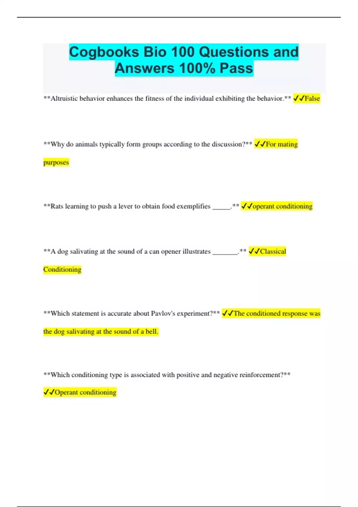 Cogbooks Bio 100 Questions and Answers 100% Pass **Altruistic behavior enhances the fitness of the individual exhibiting the behavior.** False **Why do animals typically form groups according to the discussion?** For mating purposes **Rats learning to push a lever to obtain food exemplifies _____.** operant conditioning **A dog salivating at the sound of a can opener illustrates _______.** Classical Conditioning **Which statement is accurate about Pavlov's experiment?** The conditioned response was the dog salivating at the sound of a bell. **Which conditioning type is associated with positive and negative reinforcement?** Operant conditioning **When people exhibit different emotional expressions based on their cultural backgrounds, it is an example of _______.** cultural display rule **The movement of facial muscles to convey emotion is generally considered universal across most cultures.** True **What factors determine human behavior, similar to other mammals?** A combination of genetics and learning **In which scenarios would living alone be advantageous? Select all that apply.** You are a large predatory cat living in the cramped branches of small trees. You are a small reptile susceptible to highly contagious parasites. Both scenarios apply. **When is asexual reproduction most suitable?** In a stable and predictable environment **Which reproduction method can result from the original animal being damaged?** Fragmentation Which form of reproduction is useful to an animal with little mobility that reproduces sexually? Hermaphroditism Asexual reproduction _________. results in offspring that are clones of the parent Which of the following mating systems would most likely be monogamous? The male guards the female closely, and both parents are needed to raise the offspring. Parents are naturally selected to _______ the difference between the benefits and the costs, and parental care ________exist when the benefits are substantially greater than the costs. maximize, will A reproductive mistake is ______. choosing a mate who will produce young that do not survive Females tend to be in charge of mating because _______.