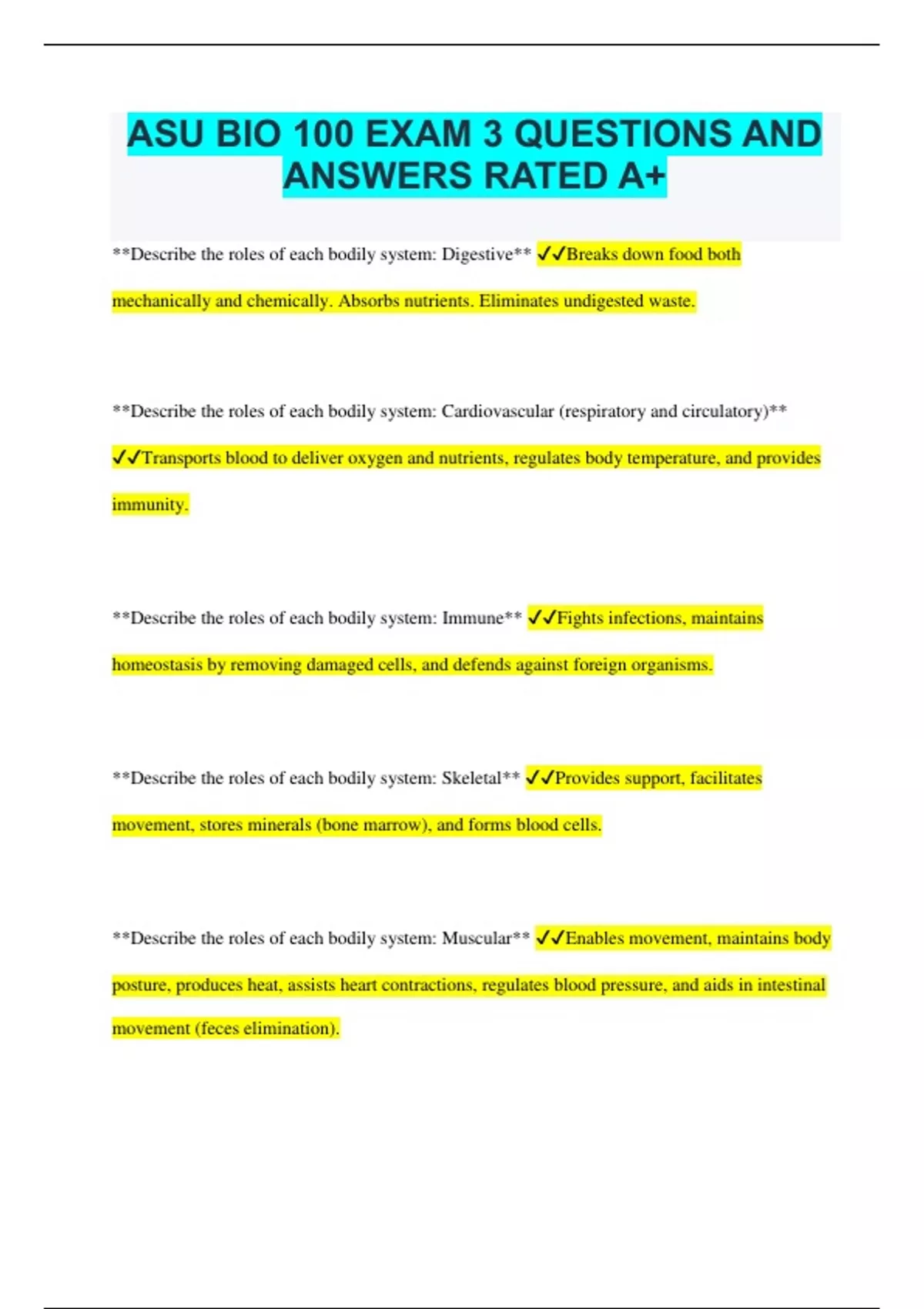 ASU BIO 100 EXAM 3 QUESTIONS AND ANSWERS RATED A+ **Describe the roles of each bodily system: Digestive** Breaks down food both mechanically and chemically. Absorbs nutrients. Eliminates undigested waste. **Describe the roles of each bodily system: Cardiovascular (respiratory and circulatory)** Transports blood to deliver oxygen and nutrients, regulates body temperature, and provides immunity. **Describe the roles of each bodily system: Immune** Fights infections, maintains homeostasis by removing damaged cells, and defends against foreign organisms. **Describe the roles of each bodily system: Skeletal** Provides support, facilitates movement, stores minerals (bone marrow), and forms blood cells. **Describe the roles of each bodily system: Muscular** Enables movement, maintains body posture, produces heat, assists heart contractions, regulates blood pressure, and aids in intestinal movement (feces elimination). **Describe the roles of each bodily system: Endocrine** Manages communication, integration, and control via hormones. **Describe the roles of each bodily system: Reproductive** Ensures the continuation of the human species. **Describe the roles of each bodily system: Nervous** Manages communication, integration, control, and recognition of sensory stimuli (CNS & PNS). **Compare and contrast the use of positive and negative feedback mechanisms in maintaining homeostasis. Explain using: Blood glucose regulation** Insulin regulation of blood sugar is a classic negative feedback example. When blood glucose levels rise, body receptors detect the change. The pancreas, as the control center, releases insulin into the bloodstream, which lowers blood glucose levels. Once homeostasis is achieved, insulin release stops. **Compare and contrast the use of positive and negative feedback mechanisms in maintaining homeostasis. Explain using: Platelet release for blood clotting** When a blood vessel is damaged, platelets adhere to the site and release chemicals that attract more platelets. This positive feedback loop continues until a clot is formed, effectively stopping the bleeding. What does it mean if an organism is an ectotherm? depend mainly on external heat sources - their body temperature changes with the temperature of the environment (reptiles, snakes, lizards) What does it mean if an organism is an Endotherm? generate most of the heat they need internally (mammals/humans/dogs) Herbivorous mammals tend to have extremely long digestive systems, especially the intestines; omnivores have intermediate length intestines; and carnivores have extremely short intestines. What might be a logical explanation for this pattern? Plants are hard to break down and need more time to get nutrients. Why do strict vegetarians (vegans) have to be more careful of their choices of food than do vegetarians that also eat cheese, eggs, and dairy products? Because they aren't getting the vitamins and amino acids the body requires to function properly How do vaccines work? The body will produce antibodies against the vaccine so when you have the real thing your body will be prepared. You may not even get sick. In Southern Copperhead snake venom; you'll find a protein called a disintegrin. Disintegrins bind to a class of membrane receptors called integrins. Platelets use integrin receptors to aggregate at a site of tissue damage. What effect do you think disintegrin has on the snake's prey? The molecule interferes with clot formation so that the venom can travel more efficiently from the site of the bite to the rest of the body. Anatomical designs that increase surface area are common in many body systems. Give examples of how surface area is maximized in the digestive, respiratory, and nervous systems of humans. Digestive: it is folded so that the tract can have a lot of meters/surface area. This allows for more absorption. Anatomical designs that increase surface area are common in many body systems. Give examples of how surface area is maximized in the digestive, respiratory, and nervous systems of humans. Respiratory: alveoli allow for an increase in surface area, which maximizes gas exchange Anatomical designs that increase surface area are common in many body systems. Give examples of how surface area is maximized in the digestive, respiratory, and nervous systems of humans. Nervous System: Wrinkles in your brain increase surface area allowing for more synaptic connections What is the role of the lungs with respect to blood circulation and gas exchange? How does this relate to the function of the heart? The