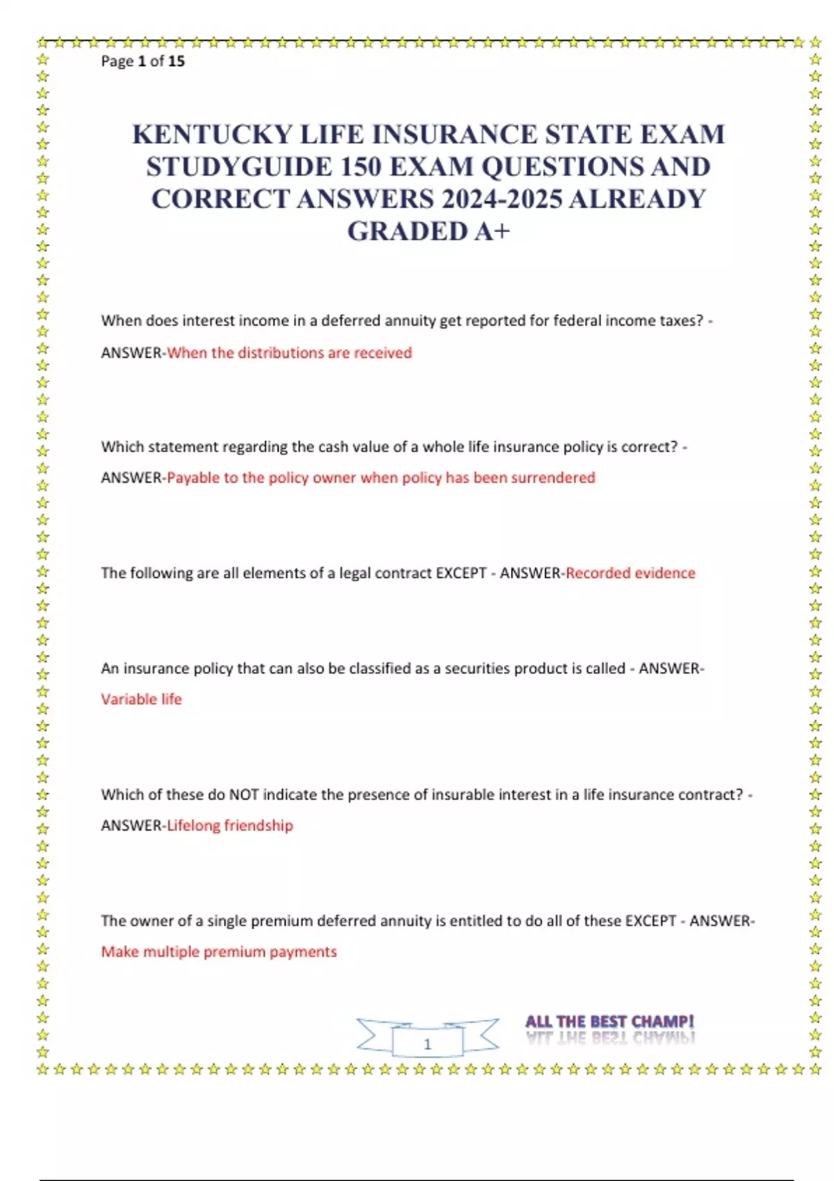 KENTUCKY LIFE INSURANCE STATE EXAM STUDYGUIDE 150 EXAM QUESTIONS AND CORRECT ANSWERS ALREADY GRADED A+.