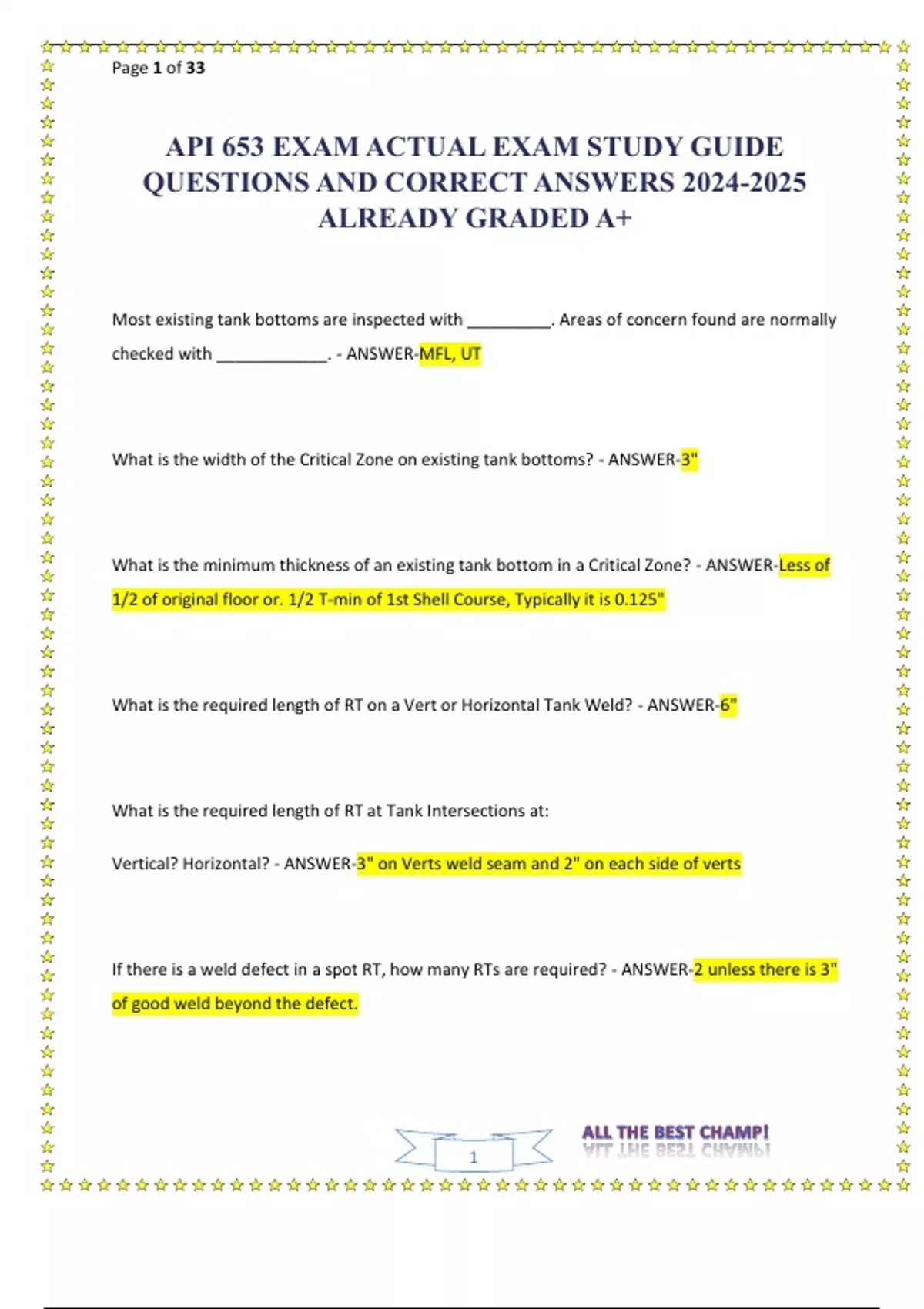 Page 1 of 33 1 API 653 EXAM ACTUAL EXAM STUDY GUIDE QUESTIONS AND CORRECT ANSWERS 2024 -2025 ALREADY GRADED A+ Most existing tank bottoms are inspected with _________. Areas of concer n found are normally checked with ____________. - ANSWER -MFL, UT What is the width of the Critical Zone on existing tank bottoms? - ANSWER -3" What is the minimum thickness of an existing tank bottom in a Critical Zone? - ANSWER -Less of 1/2 of original fl oor or. 1/2 T -min of 1st Shell Course, Typically it is 0.125" What is the required length of RT on a Vert or Horizontal Tank Weld? - ANSWER -6" What is the required length of RT at Tank Intersections at: Vertical? Horizontal? - ANSWER -3" on Verts weld seam and 2" on each side of verts If there is a weld defect in a spot RT, how many RTs are required? - ANSWER -2 unless there is 3" of good weld bey ond the defect. Page 2 of 33 2 Method for RT: RT is shot to____________? - ANSWER -ASME Section V What requirements are needed for Personnel to shoot an RT on a Tank? - ANSWER -ASNT SNT -