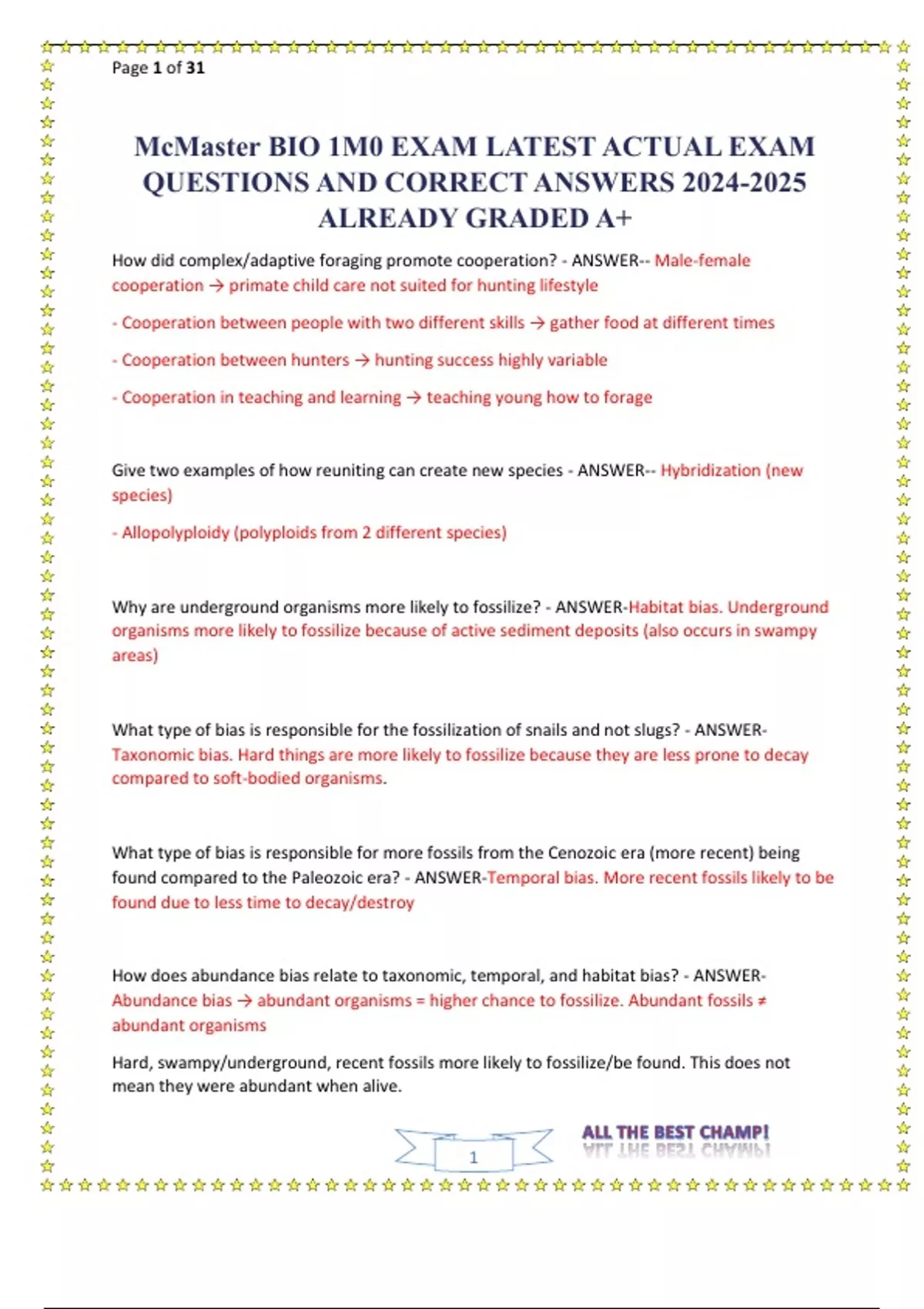 McMaster BIO 1M0 EXAM LATEST ACTUAL EXAM QUESTIONS AND CORRECT ANSWERS ALREADY GRADED A+
