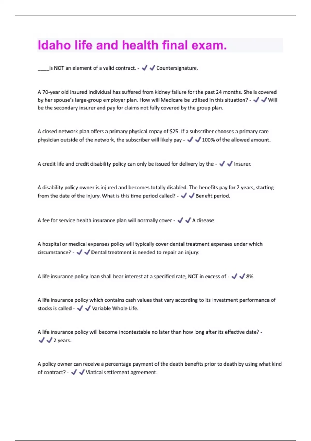 ____is NOT an element of a valid contract. - Countersignature. A 70-year old insured individual has suffered from kidney failure for the past 24 months. She is covered by her spouse's large-group employer plan. How will Medicare be utilized in this situation? - Will be the secondary insurer and pay for claims not fully covered by the group plan. A closed network plan offers a primary physical copay of $25. If a subscriber chooses a primary care physician outside of the network, the subscriber will likely pay - 100% of the allowed amount. A credit life and credit disability policy can only be issued for delivery by the - Insurer. A disability policy owner is injured and becomes totally disabled. The benefits pay for 2 years, starting from the date of the injury. What is this time period called? - Benefit period. A fee for service health insurance plan will normally cover - A disease. A hospital or medical expenses policy will typically cover dental treatment expenses under which circumstance? - Dental treatment is needed to repair an injury. A life insurance policy loan shall bear interest at a specified rate, NOT in excess of - 8% A life insurance policy which contains cash values that vary according to its investment performance of stocks is called - Variable Whole Life. A life insurance policy will become incontestable no later than how long after its effective date? - 2 years. A policy owner can receive a percentage payment of the death benefits prior to death by using what kind of contract? - Viatical settlement agreement.