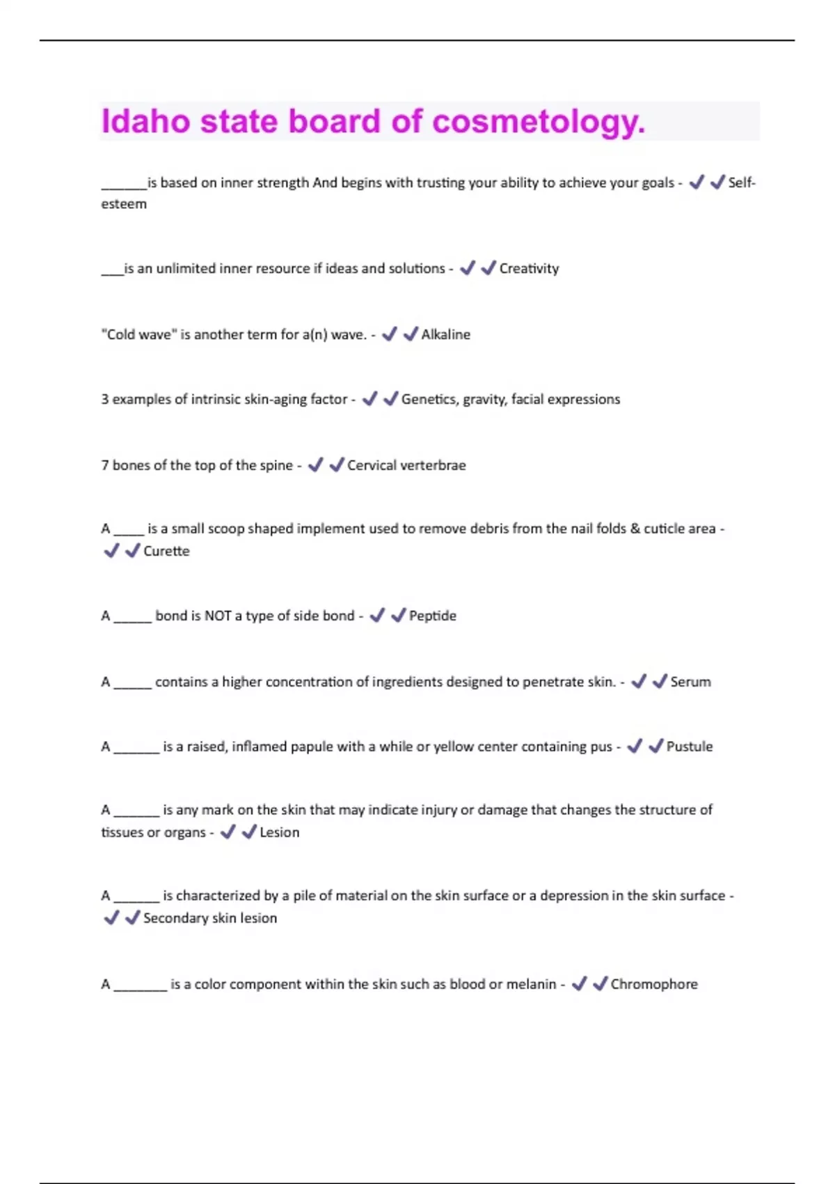 ______is based on inner strength And begins with trusting your ability to achieve your goals - Selfesteem ___is an unlimited inner resource if ideas and solutions - Creativity "Cold wave" is another term for a(n) wave. - Alkaline 3 examples of intrinsic skin-aging factor - Genetics, gravity, facial expressions 7 bones of the top of the spine - Cervical verterbrae A ____ is a small scoop shaped implement used to remove debris from the nail folds & cuticle area - Curette A _____ bond is NOT a type of side bond - Peptide A _____ contains a higher concentration of ingredients designed to penetrate skin. - Serum A ______ is a raised, inflamed papule with a while or yellow center containing pus - Pustule A ______ is any mark on the skin that may indicate injury or damage that changes the structure of tissues or organs - Lesion A ______ is characterized by a pile of material on the skin surface or a depression in the skin surface - Secondary skin lesion A _______ is a color component within the skin such as blood or melanin - ChromophoreA _______ uses impellers to circulate water - Pipeless foot spa A ______is a raised bump that is often red due to inflammation and sore due to the pressure of swelling - Papule A _____established the purpose and values by which an individual or institution lives and works - Mission statement A _____is a closed, abnormally developed sac that contains pus, semi fluid or morbid matter, above or below the skin, which cannot be drained of fluid - Tubercle