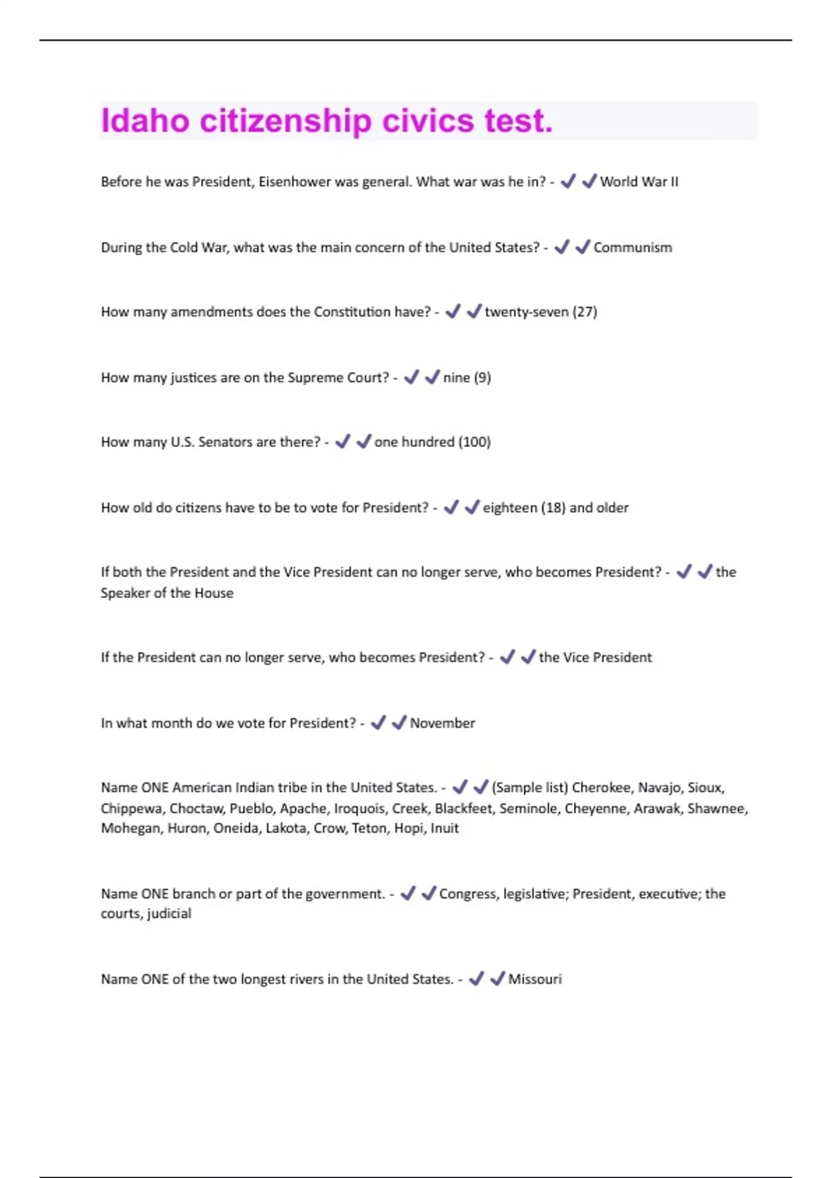 Before he was President, Eisenhower was general. What war was he in? - World War II During the Cold War, what was the main concern of the United States? - Communism How many amendments does the Constitution have? - twenty-seven (27) How many justices are on the Supreme Court? - nine (9) How many U.S. Senators are there? - one hundred (100) How old do citizens have to be to vote for President? - eighteen (18) and older If both the President and the Vice President can no longer serve, who becomes President? - the Speaker of the House If the President can no longer serve, who becomes President? - the Vice President In what month do we vote for President? - November Name ONE American Indian tribe in the United States. - (Sample list) Cherokee, Navajo, Sioux, Chippewa, Choctaw, Pueblo, Apache, Iroquois, Creek, Blackfeet, Seminole, Cheyenne, Arawak, Shawnee, Mohegan, Huron, Oneida, Lakota, Crow, Teton, Hopi, Inuit Name ONE branch or part of the government. - Congress, legislative; President, executive; the courts, judicial Name ONE of the two longest rivers in the United States. - Missouri