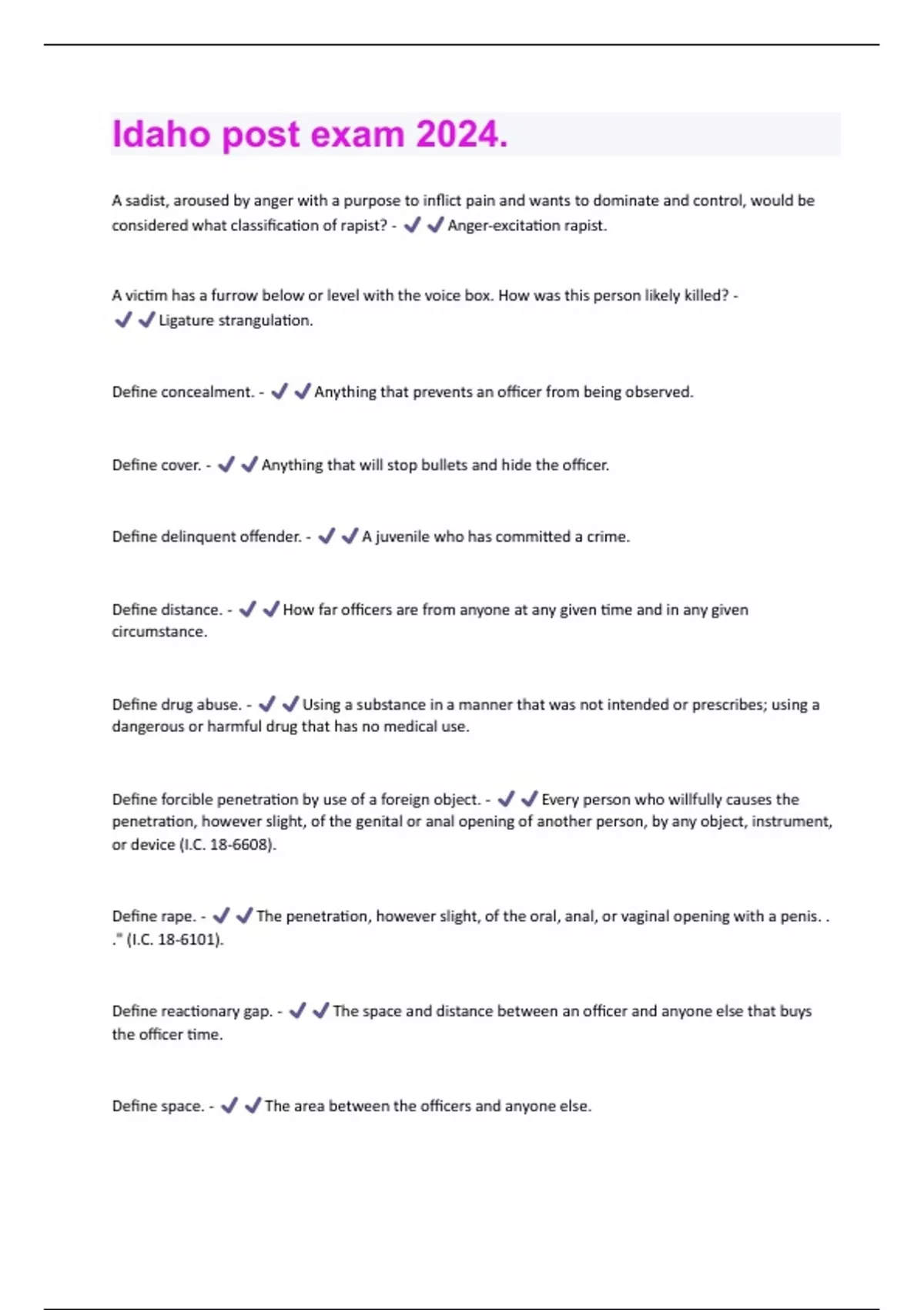A sadist, aroused by anger with a purpose to inflict pain and wants to dominate and control, would be considered what classification of rapist? - Anger-excitation rapist. A victim has a furrow below or level with the voice box. How was this person likely killed? - Ligature strangulation. Define concealment. - Anything that prevents an officer from being observed. Define cover. - Anything that will stop bullets and hide the officer. Define delinquent offender. - A juvenile who has committed a crime. Define distance. - How far officers are from anyone at any given time and in any given circumstance. Define drug abuse. - Using a substance in a manner that was not intended or prescribes; using a dangerous or harmful drug that has no medical use. Define forcible penetration by use of a foreign object. - Every person who willfully causes the penetration, however slight, of the genital or anal opening of another person, by any object, instrument, or device (I.C. 18-6608). Define rape. - The penetration, however slight, of the oral, anal, or vaginal opening with a penis. . ." (I.C. 18-6101). Define reactionary gap. - The space and distance between an officer and anyone else that buys the officer time. Define space. - The area between the officers and anyone else.Define time. - How long an officer needs to react to the cues and stimuli from others. Describe a barricade situation. - An incident where a person maintains a position of cover or concealment, ignores or resists law enforcement, and it is reasonable to believe the subject is armed with a dangerous or deadly weapon