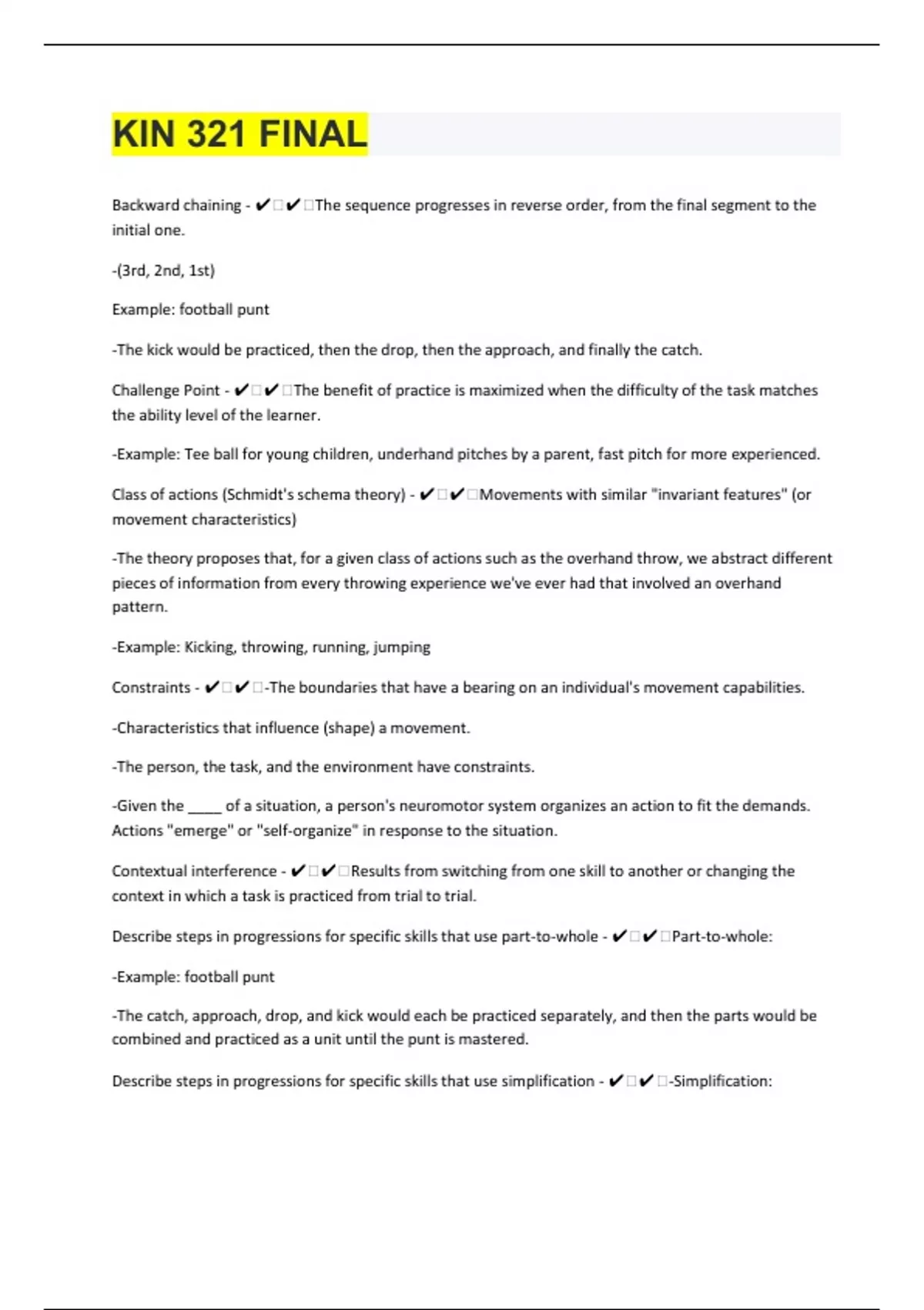 Backward chaining - ️️The sequence progresses in reverse order, from the final segment to the initial one. -(3rd, 2nd, 1st) Example: football punt -The kick would be practiced, then the drop, then the approach, and finally the catch. Challenge Point - ️️The benefit of practice is maximized when the difficulty of the task matches the ability level of the learner. -Example: Tee ball for young children, underhand pitches by a parent, fast pitch for more experienced. Class of actions (Schmidt's schema theory) - ️️Movements with similar "invariant features" (or movement characteristics) -The theory proposes that, for a given class of actions such as the overhand throw, we abstract different pieces of information from every throwing experience we've ever had that involved an overhand pattern. -Example: Kicking, throwing, running, jumping Constraints - ️️-The boundaries that have a bearing on an individual's movement capabilities. -Characteristics that influence (shape) a movement. -The person, the task, and the environment have constraints. -Given the ____ of a situation, a person's neuromotor system organizes an action to fit the demands. Actions "emerge" or "self-organize" in response to the situation. Contextual interference - ️️Results from switching from one skill to another or changing the context in which a task is practiced from trial to trial. Describe steps in progressions for specific skills that use part-to-whole - ️️Part-to-whole: -Example: football punt -The catch, approach, drop, and kick would each be practiced separately, and then the parts would be combined and practiced as a unit until the punt is mastered. Describe steps in progressions for specific skills that use simplification - ️️-Simplification: