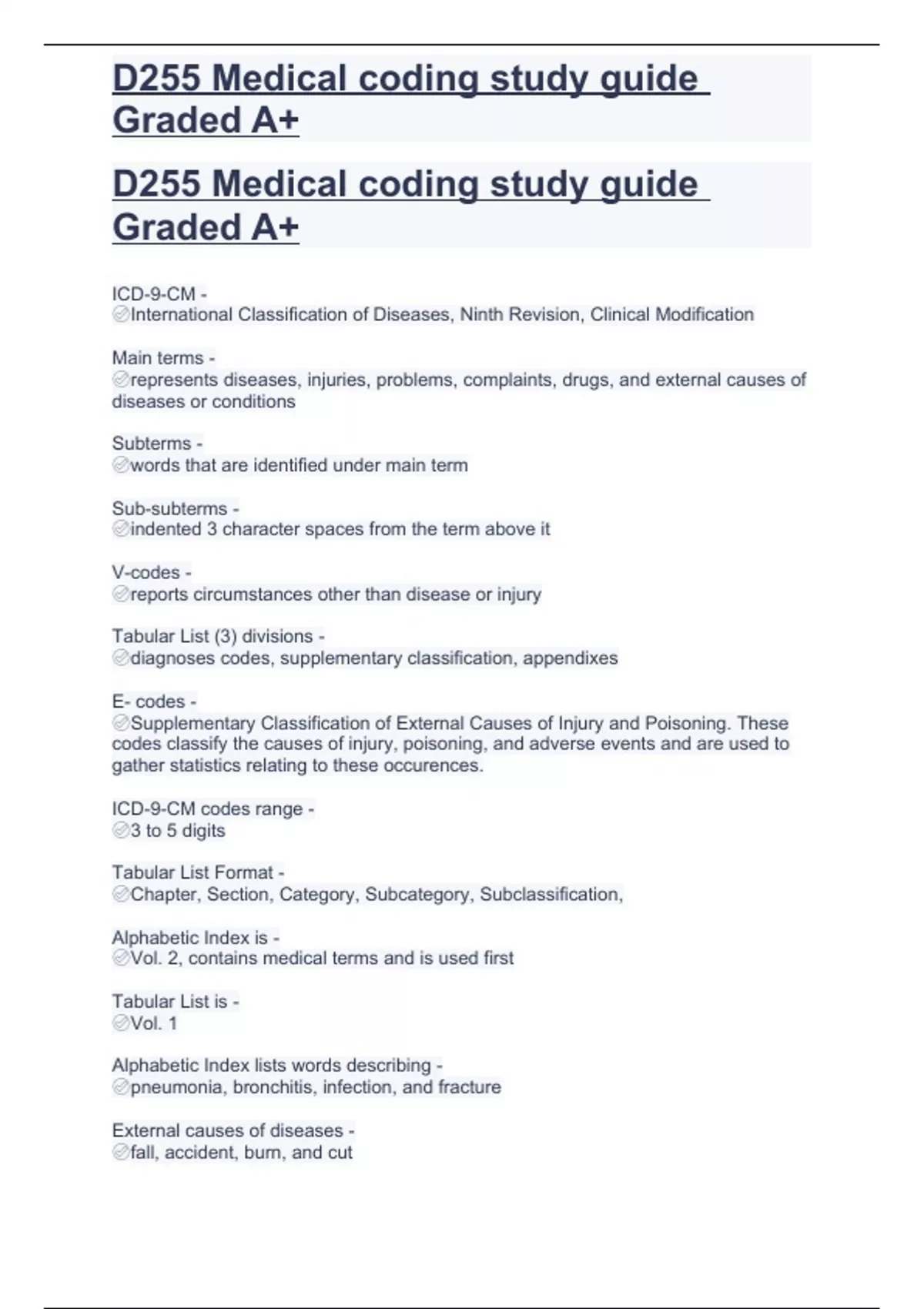 ICD-9-CM - International Classification of Diseases, Ninth Revision, Clinical Modification Main terms - represents diseases, injuries, problems, complaints, drugs, and external causes of diseases or conditions Subterms - words that are identified under main term Sub-subterms - indented 3 character spaces from the term above it V-codes - reports circumstances other than disease or injury Tabular List (3) divisions - diagnoses codes, supplementary classification, appendixes E- codes - Supplementary Classification of External Causes of Injury and Poisoning. These codes classify the causes of injury, poisoning, and adverse events and are used to gather statistics relating to these occurences.
