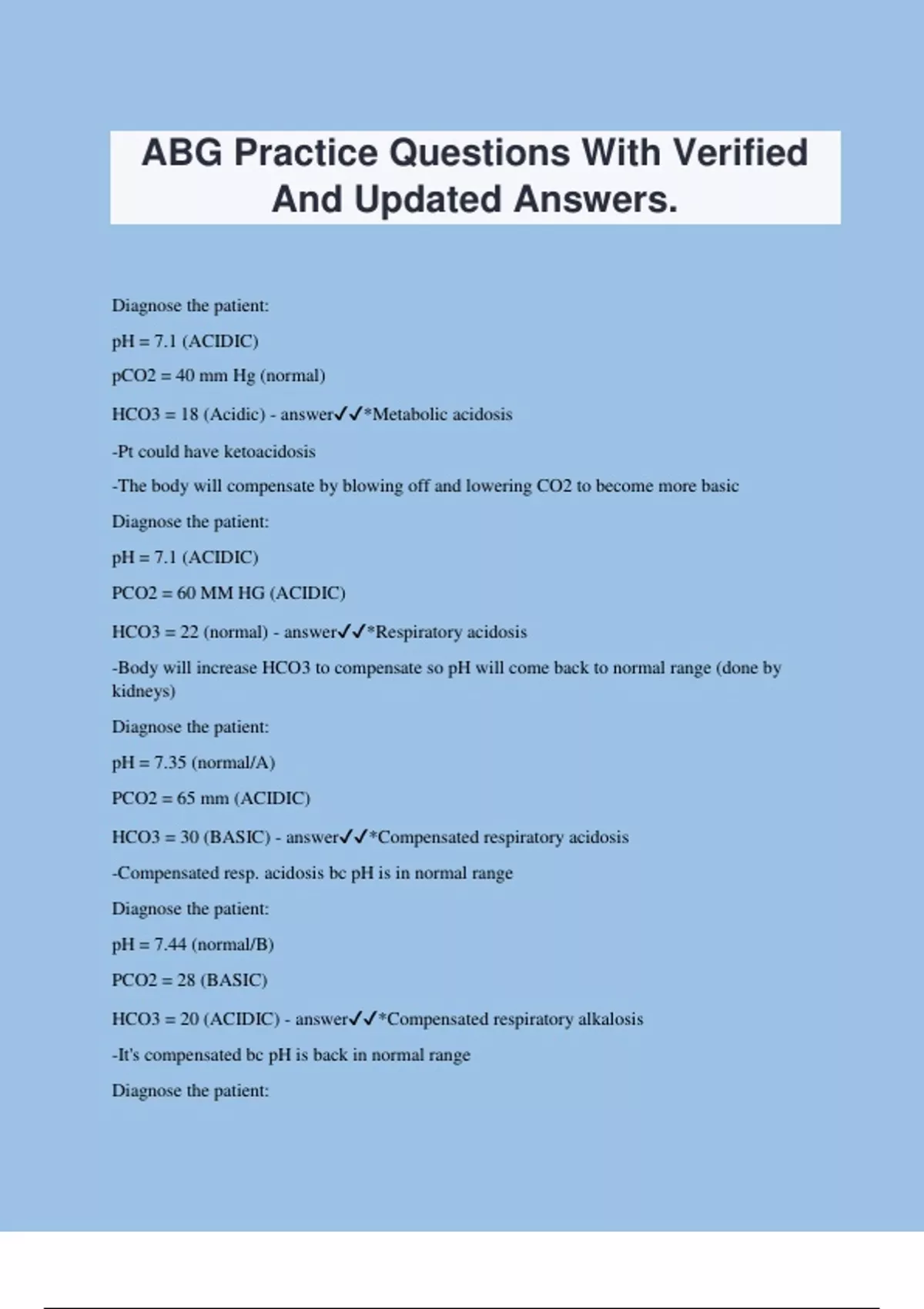 ABG Practice Questions With Verified And Updated Answers. Diagnose the patient: pH = 7.1 (ACIDIC) pCO2 = 40 mm Hg (normal) HCO3 = 18 (Acidic) - answer*Metabolic acidosis -Pt could have ketoacidosis -The body will compensate by blowing off and lowering CO2 to become more basic Diagnose the patient: pH = 7.1 (ACIDIC) PCO2 = 60 MM HG (ACIDIC) HCO3 = 22 (normal) - answer*Respiratory acidosis -Body will increase HCO3 to compensate so pH will come back to normal range (done by kidneys) Diagnose the patient: pH = 7.35 (normal/A) PCO2 = 65 mm (ACIDIC) HCO3 = 30 (BASIC) - answer*Compensated respira